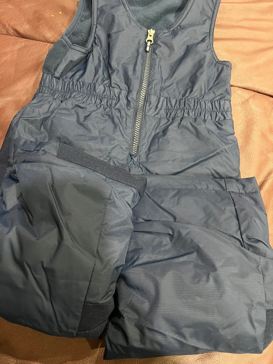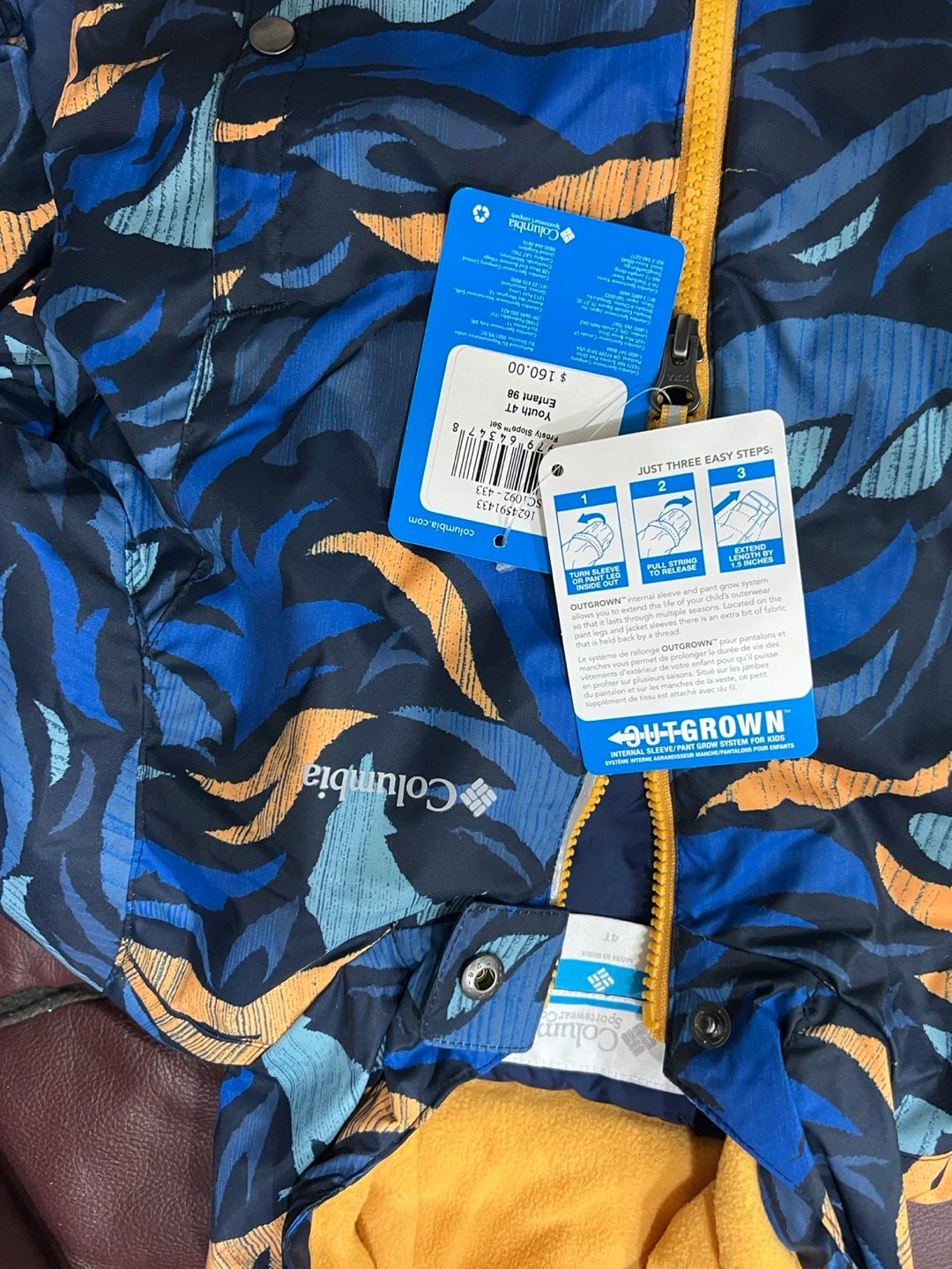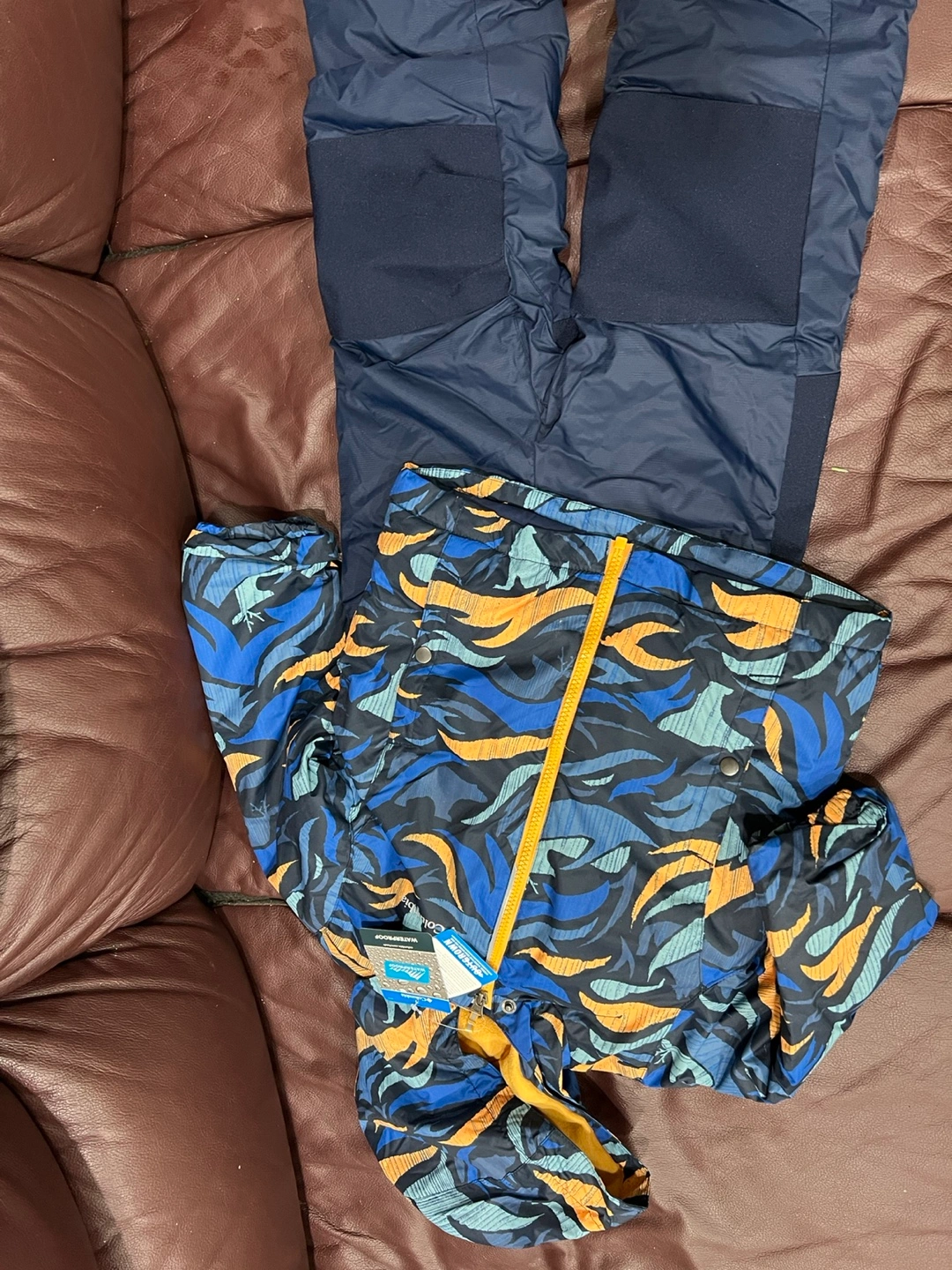 Blue snowsuit with a blue and orange patterned jacket. Features an internal sleeve/pant grow system.