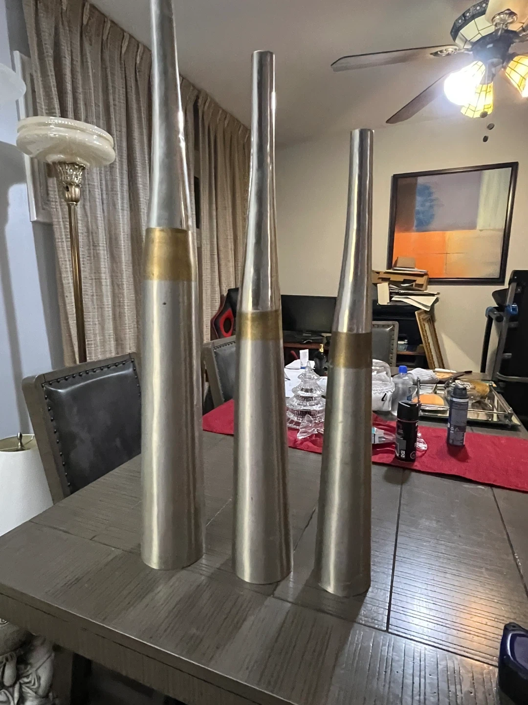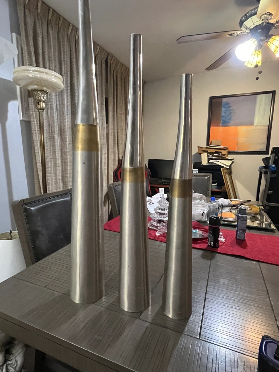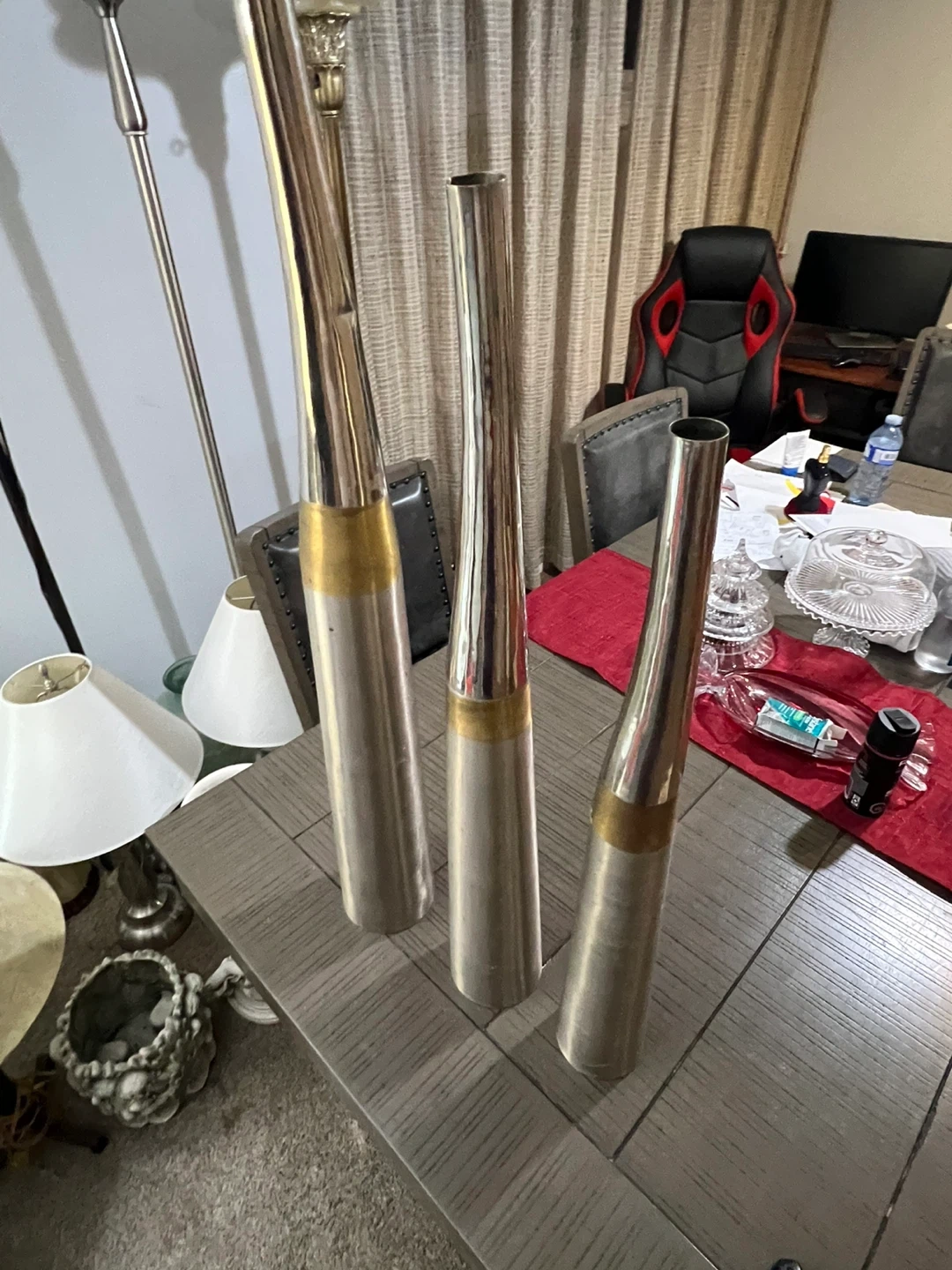 A set of three tall, cone-shaped vases. They have a metallic silver finish with a gold band accent. These would make a striking decorative addition to any room.