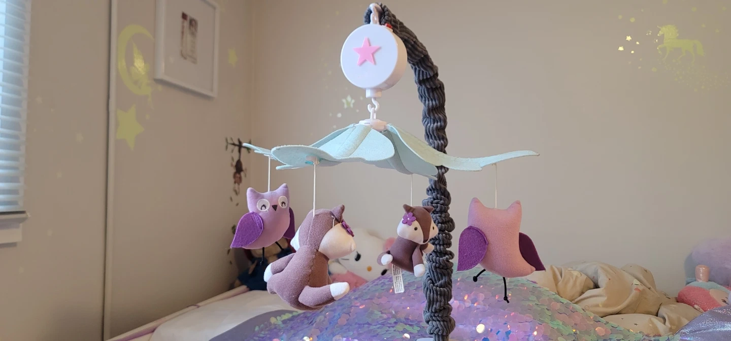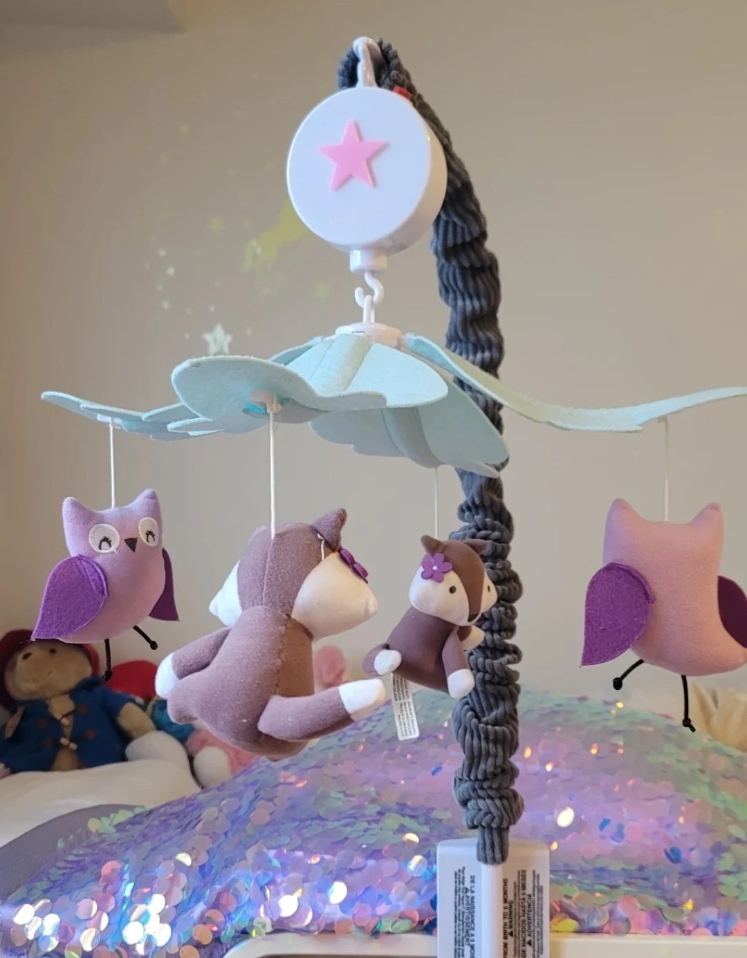 A cute baby mobile featuring plush owls and foxes! It's in great condition and ready to soothe your little one to sleep. The mobile has a star-shaped music box -with batteries that plays a lullabies while the plush animals gently rotate around.
