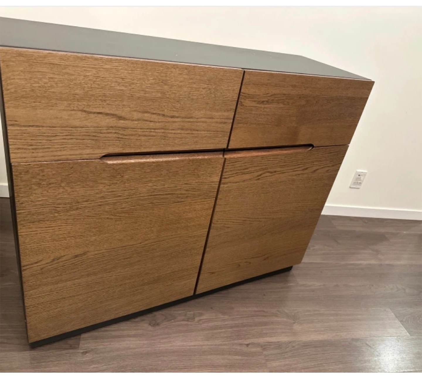 A stylish sideboard featuring a natural wood grain finish on the doors and a matte grey top. It offers ample storage with its cabinet doors. This piece would look great in a living room or dining area!(120*42, 97 cm )