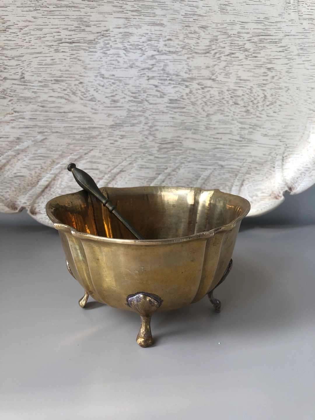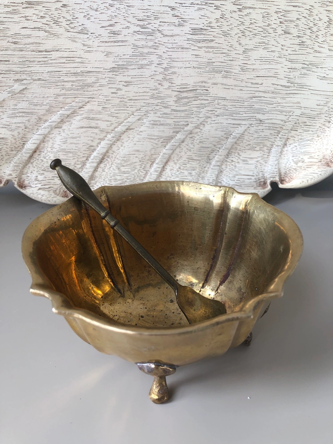 Vintage brass footed bowl with scoop (and its footed!) Perfect for small chocolates, candies, soaps, bath salts... a fantastic decor piece for your bathroom π