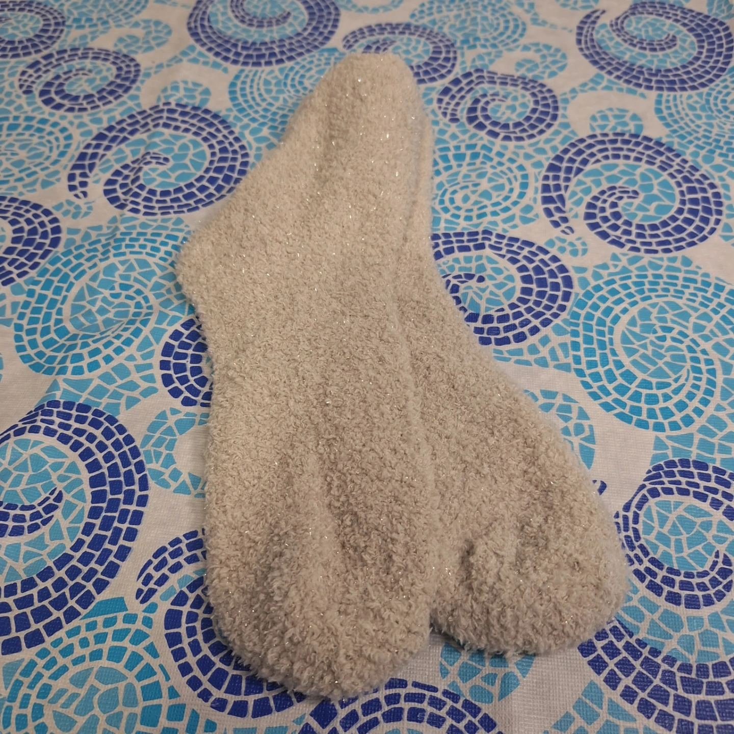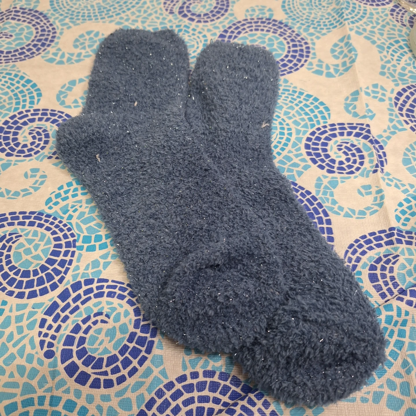 These cozy fuzzy socks have a subtle sparkle woven in. They're super soft and comfy for lounging around the house. Available in teal, cream, pink, blue, and black. One size fits most.
