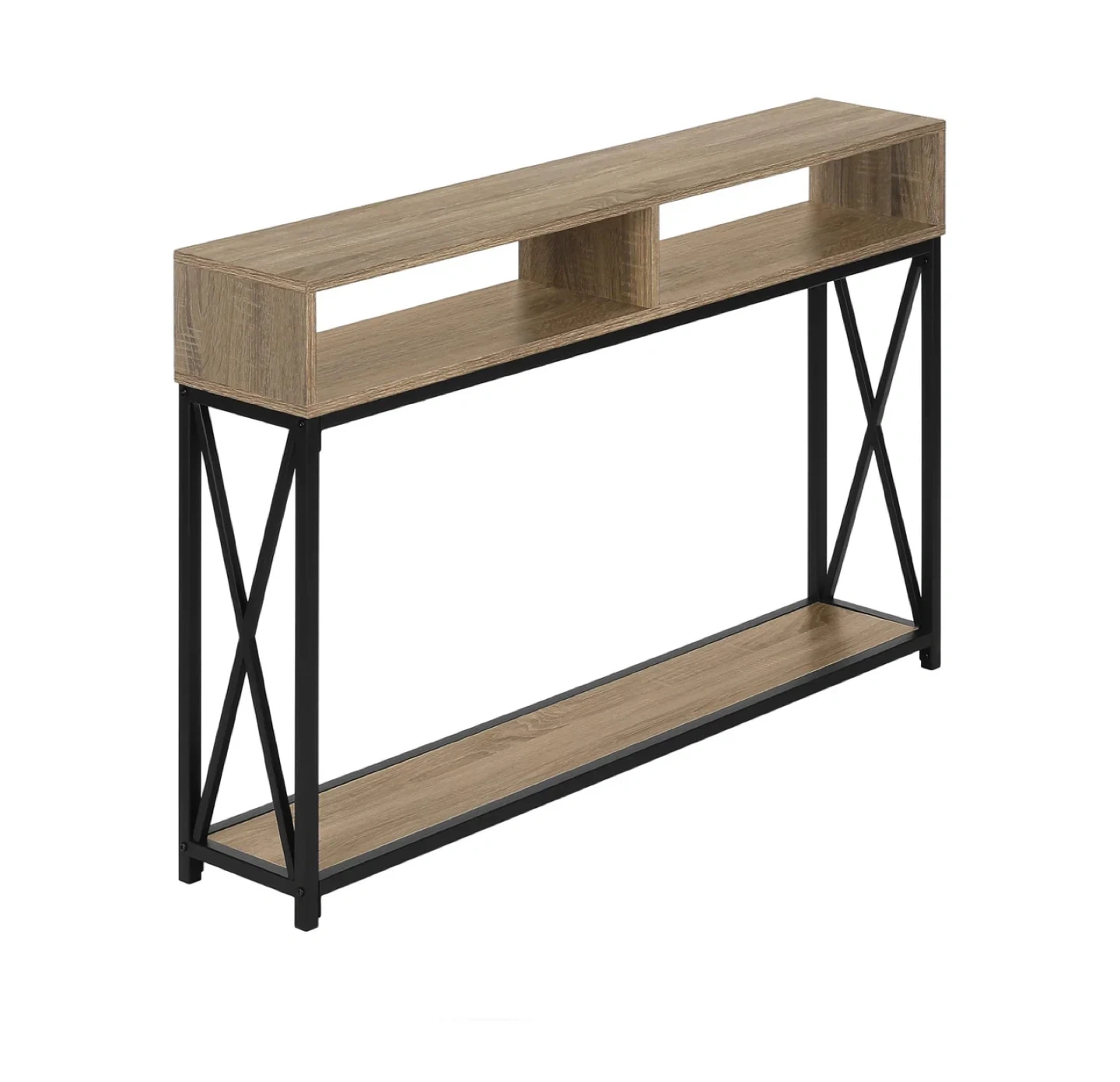 Excellent condition. This console table features a rustic wood top and a lower shelf, supported by a black metal frame. It offers two open cubbies on top and a wider shelf below. The slim design makes it a good fit for entryways or narrow spaces.