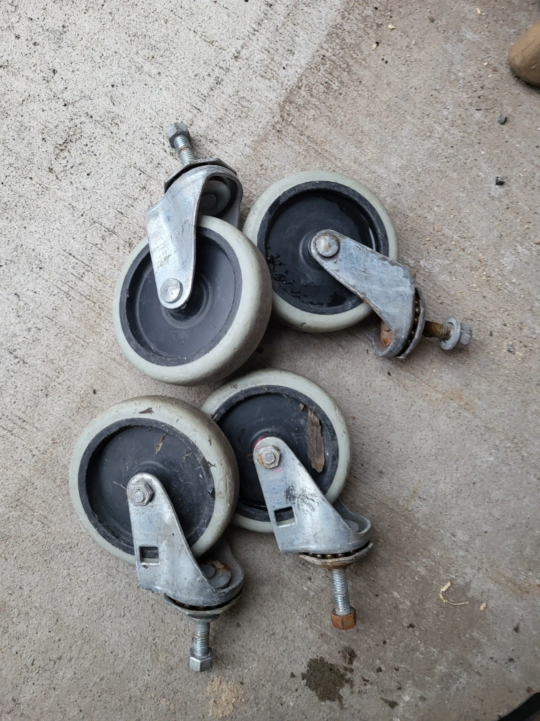 Four caster wheels with metal brackets and threaded bolts. The wheels have grey rubber treads and black centres. These are replacements for rolling carts or furniture.