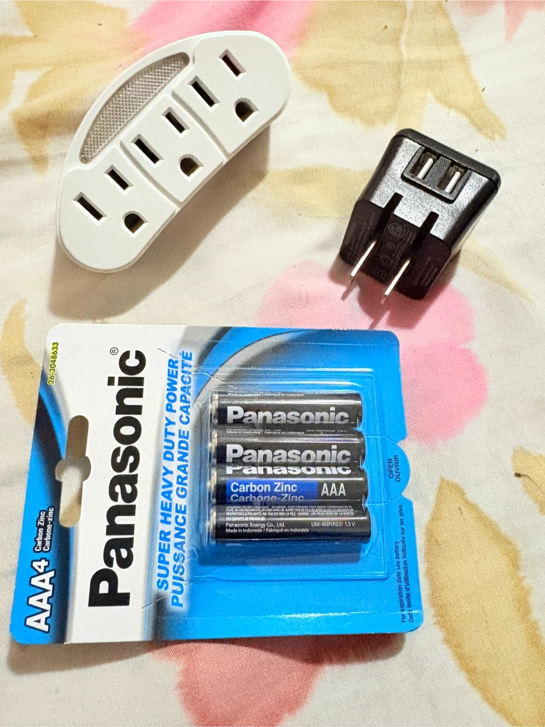 Panasonic AAA Batteries, Triple Outlet Adapter, and USB Charger
