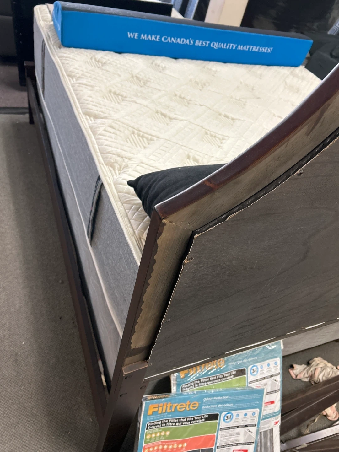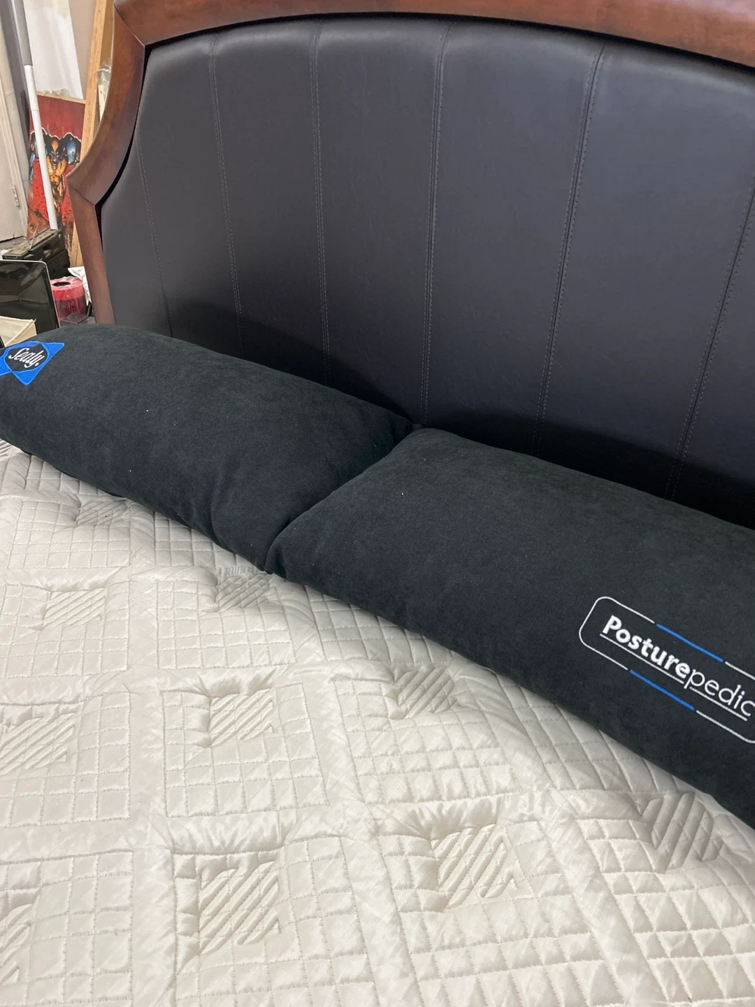 Sealy Posturepedic mattress set with a dark wood bed frame. This mattress offers comfortable support for a good night's sleep. Includes two decorative pillows.