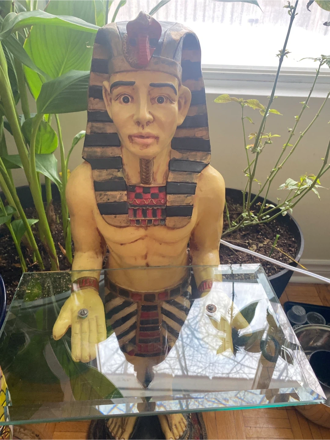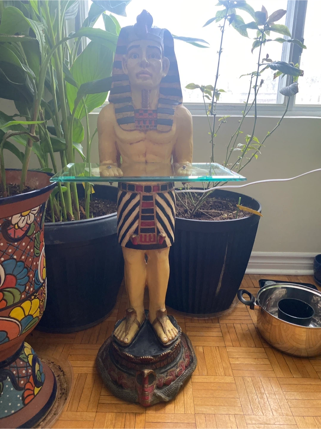 This unique Egyptian-themed statue serves as a pedestal with a glass top. It's perfect for displaying small items or as a conversation piece in your living space. The statue has a detailed pharaoh design.