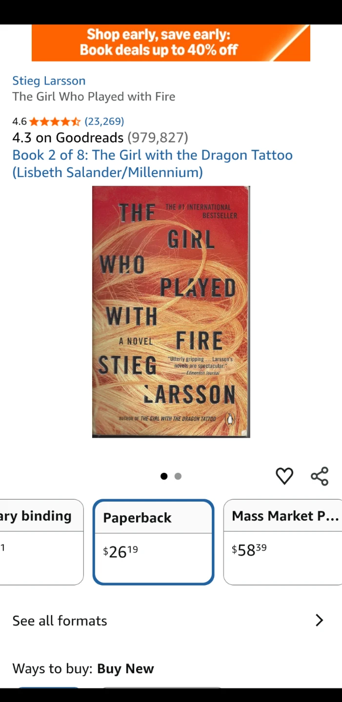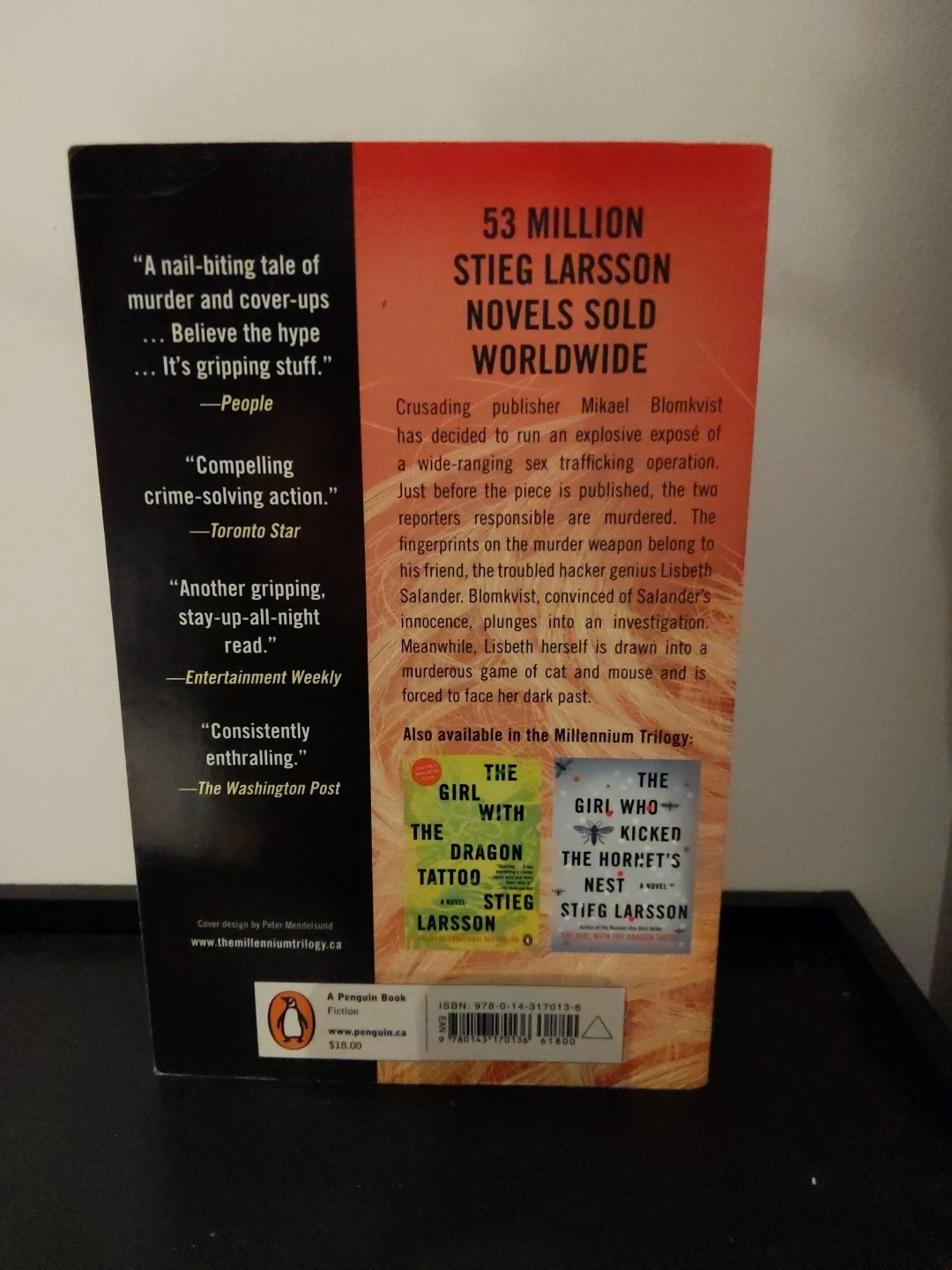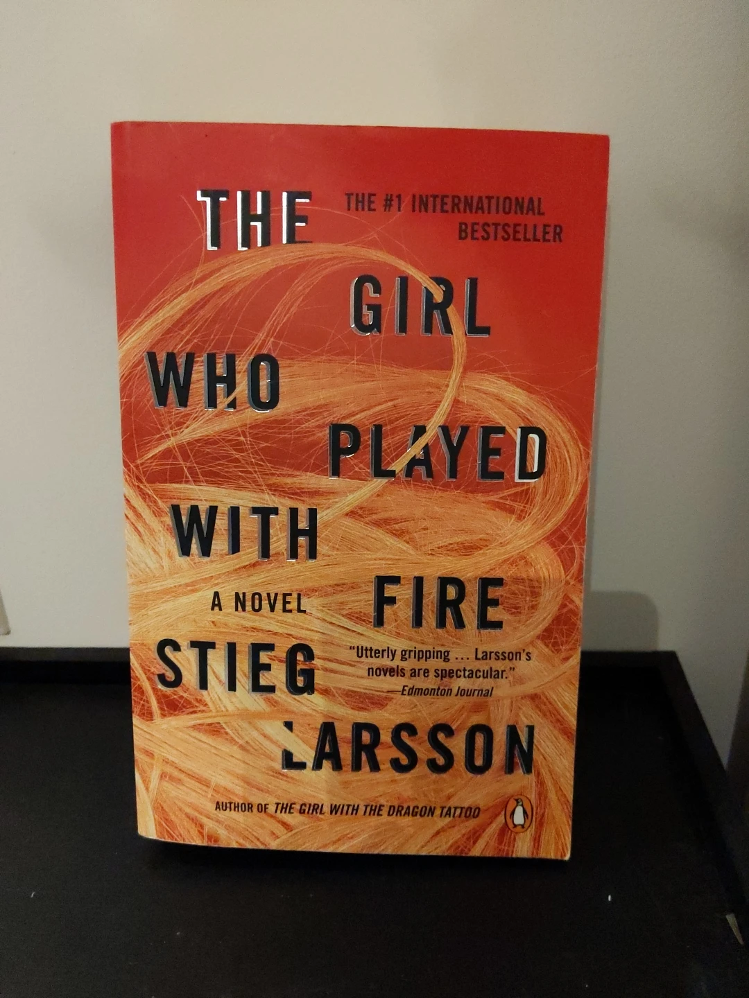 Selling a copy of "The Girl Who Played with Fire" by Stieg Larsson! It's part of the Millennium Trilogy and is a compelling crime-solving novel.