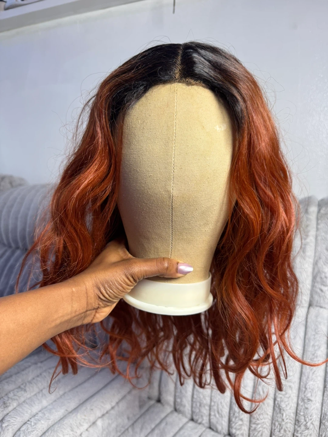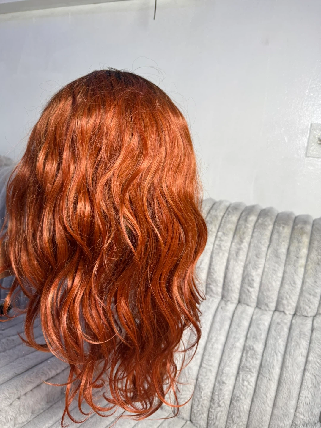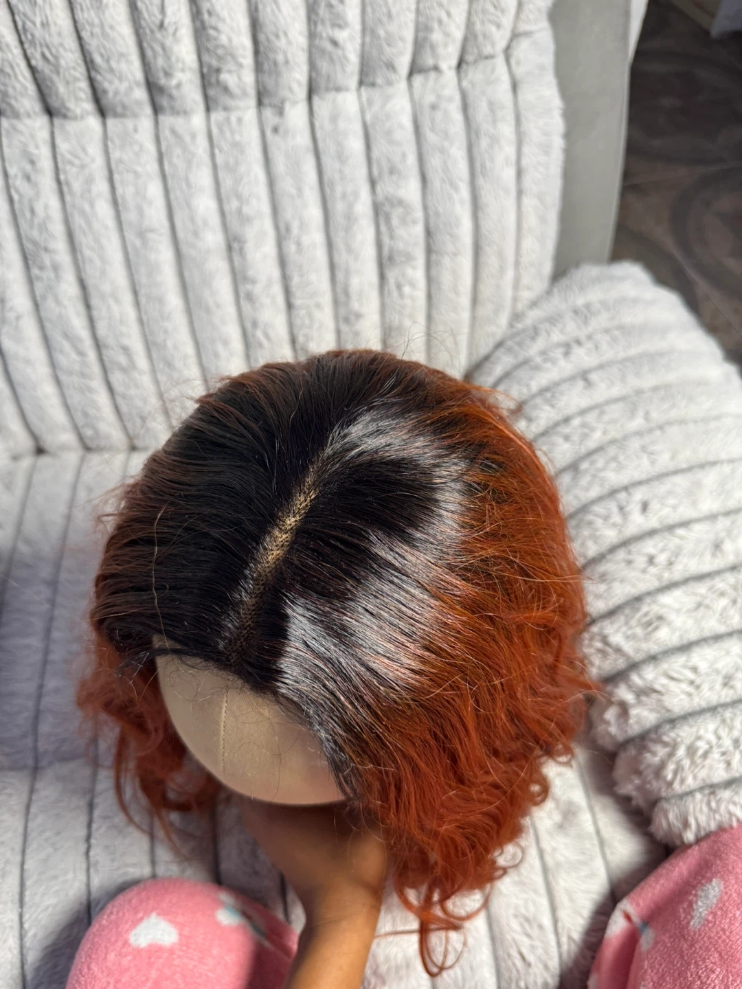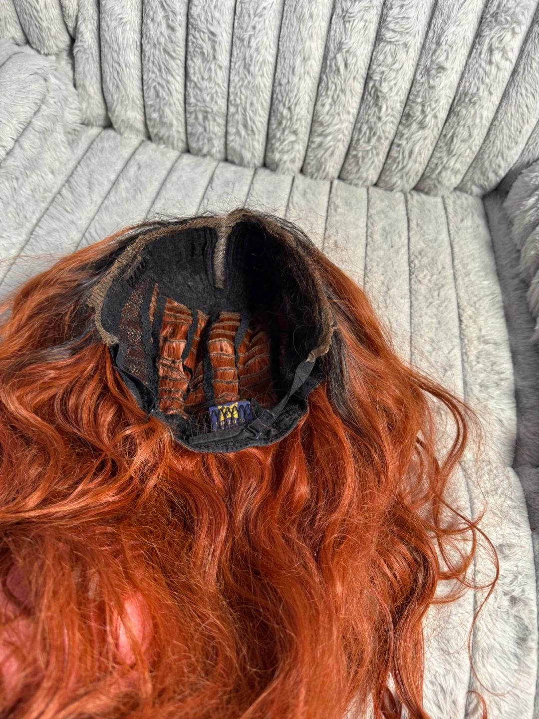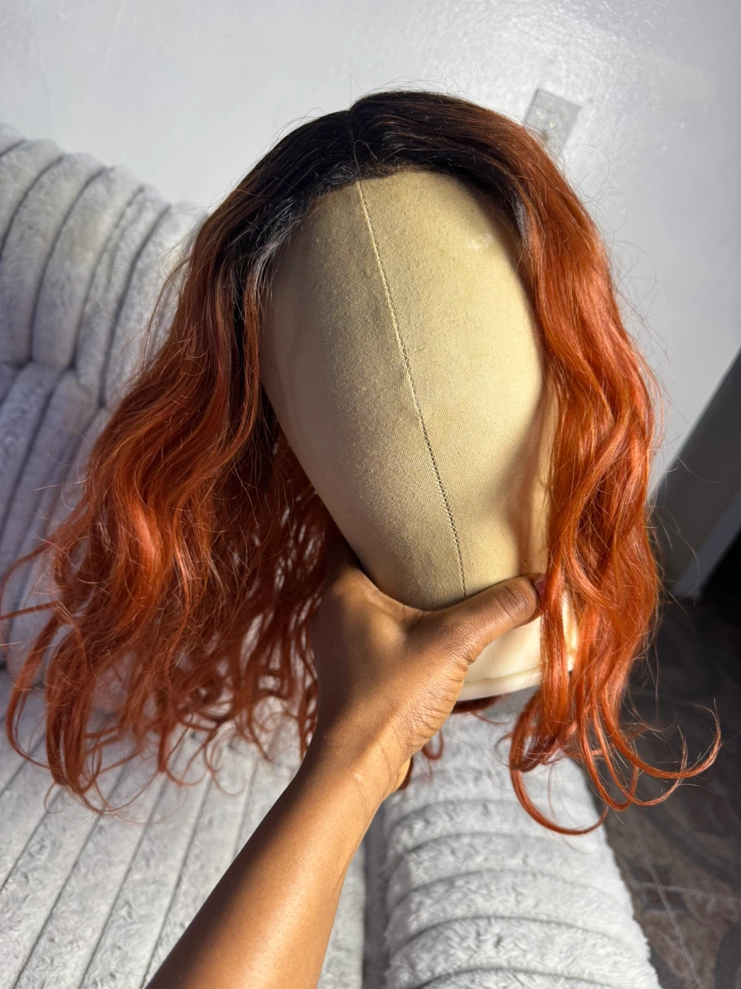 Wig with a warm orange and black ombre color. It features a wavy texture and a natural-looking part. This wig is made with synthetic fibers.