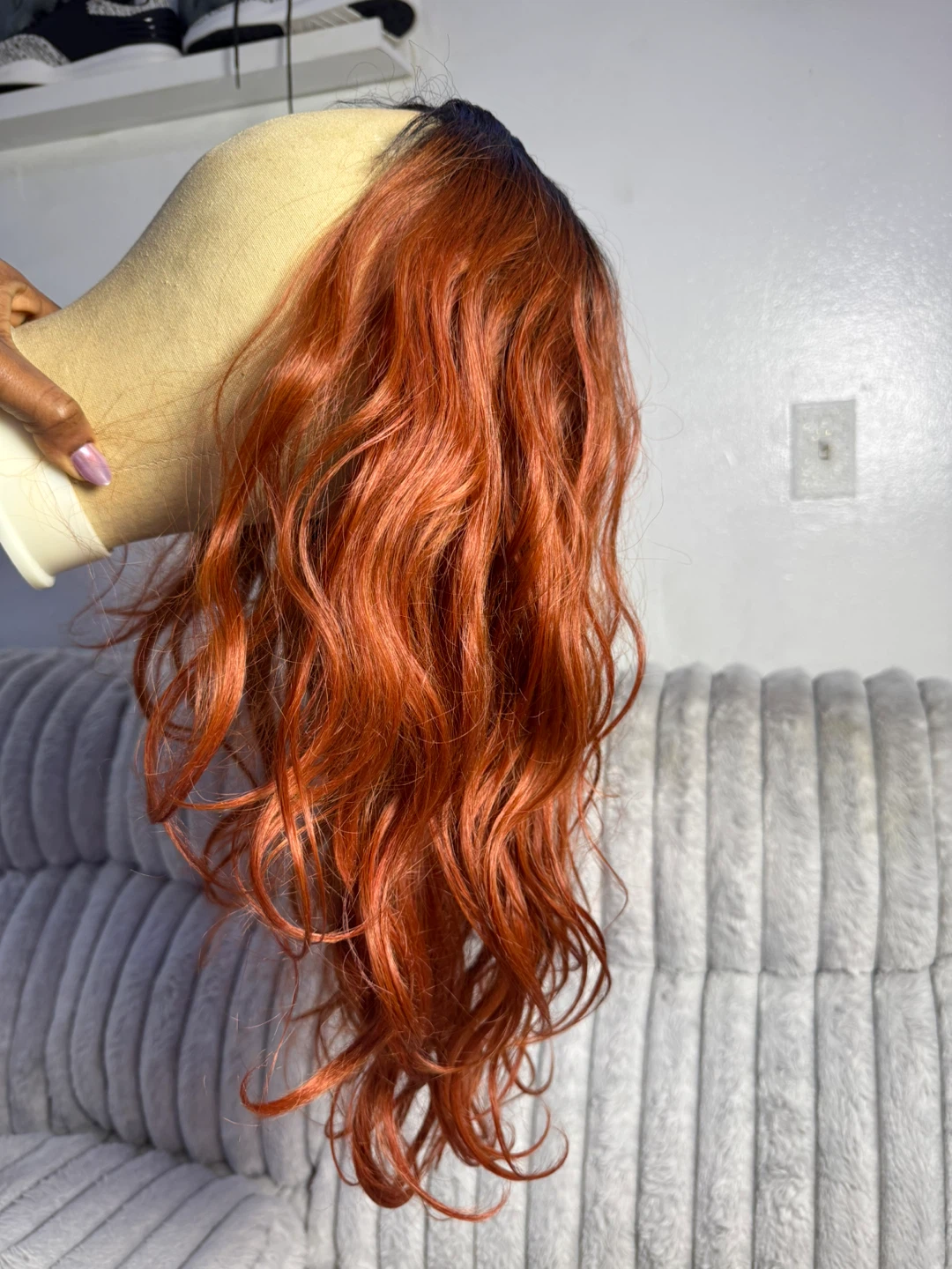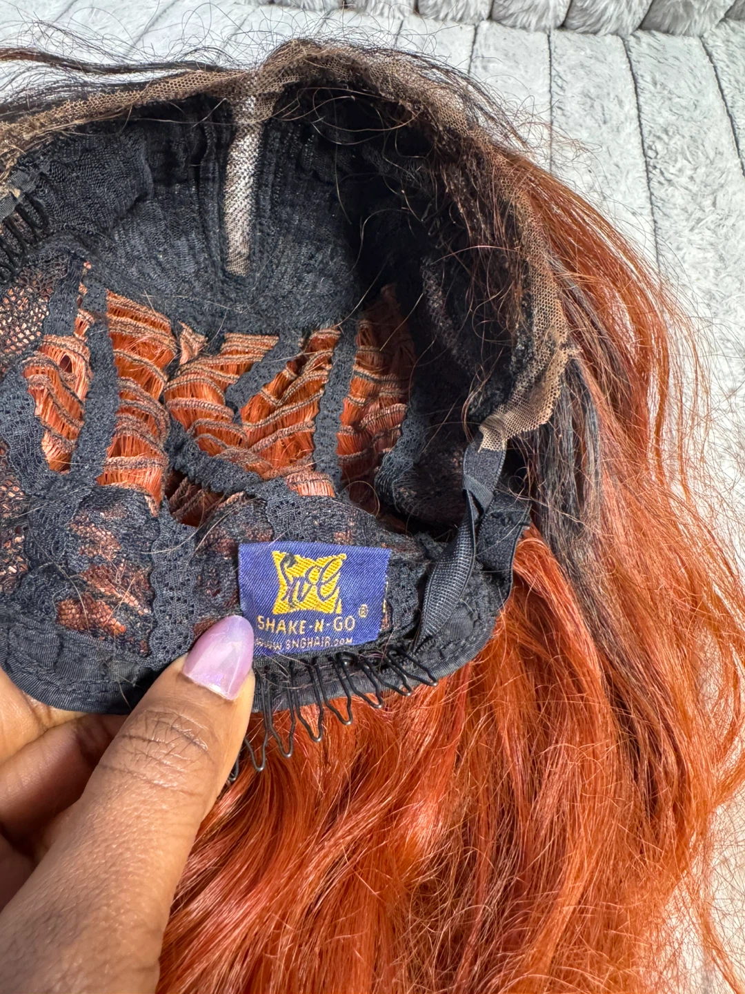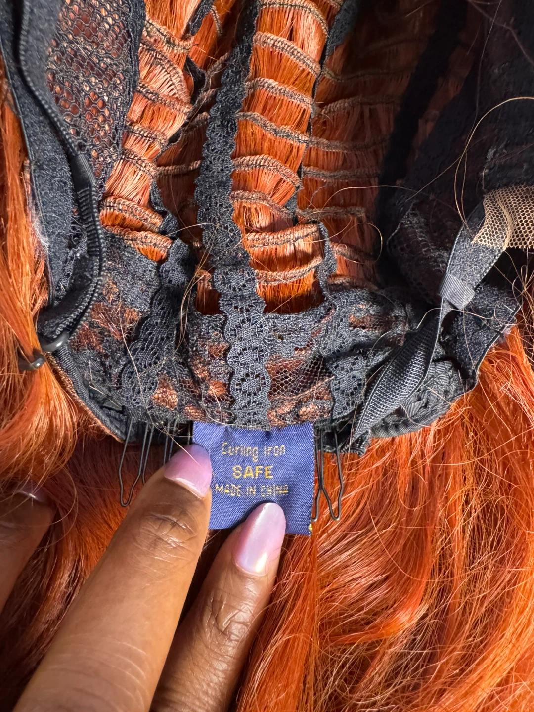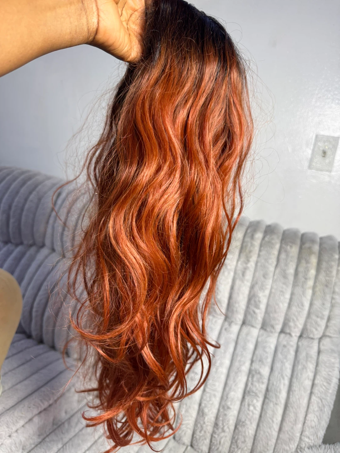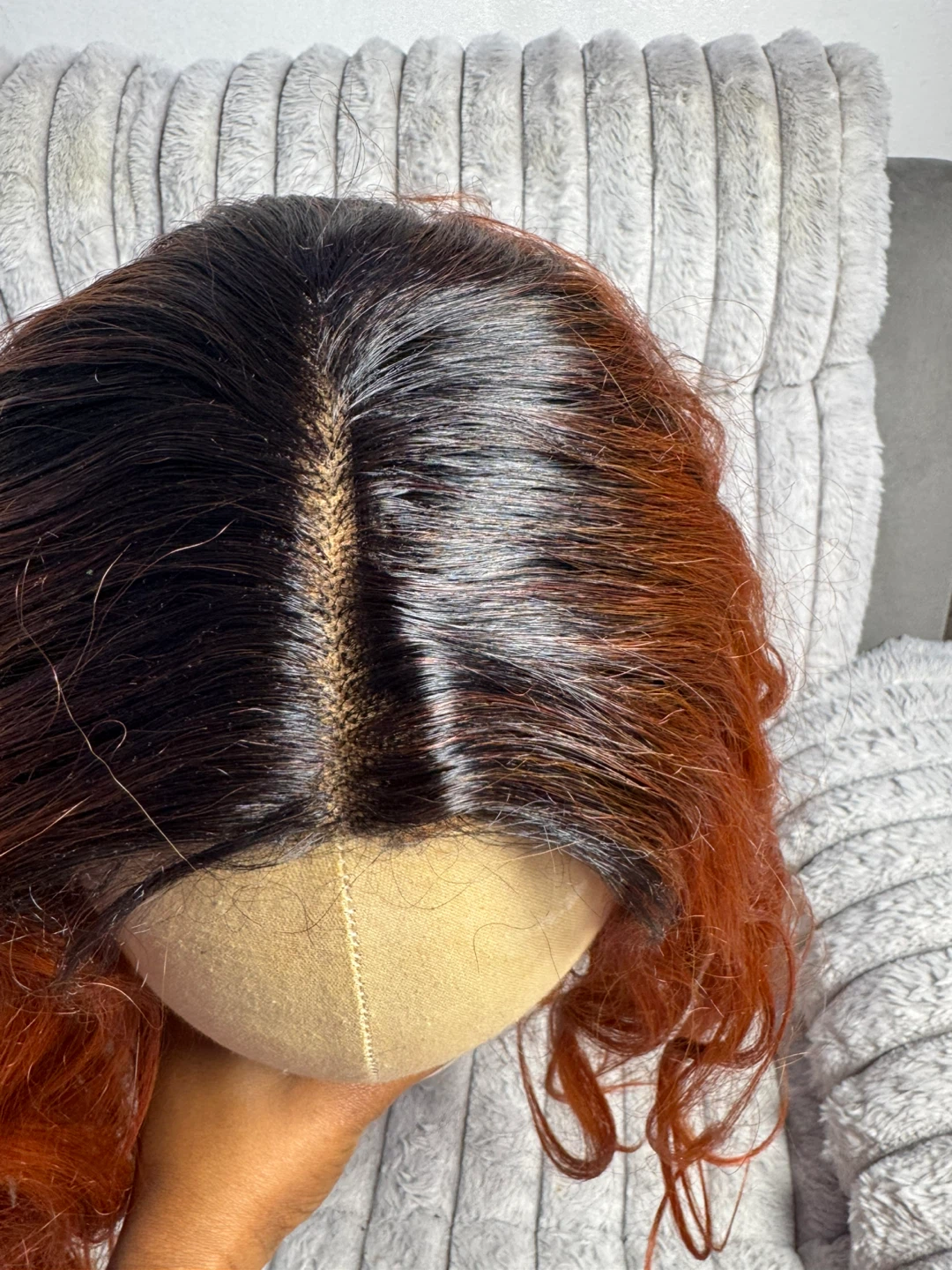 Wig with a warm orange and black ombre color. It features a wavy texture and a natural-looking part. This wig is made with synthetic fibers.