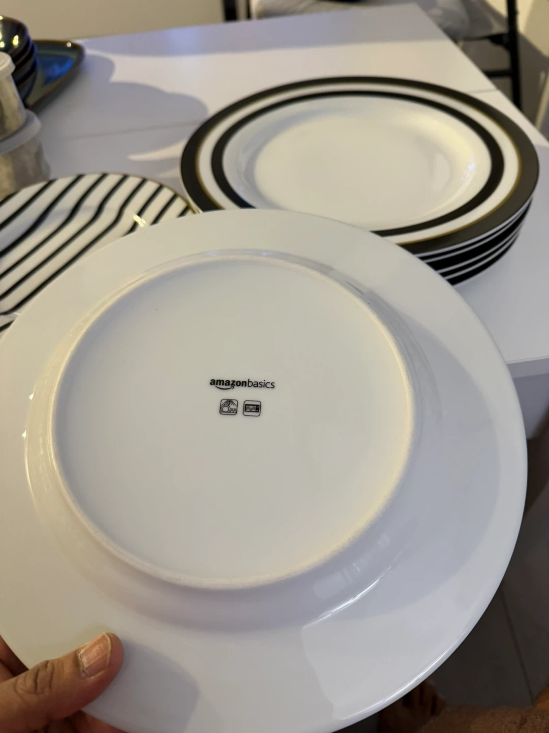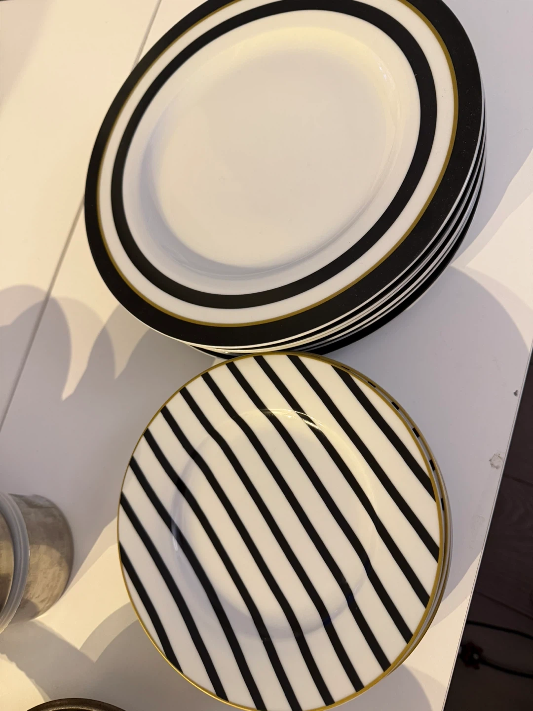 Selling a set of AmazonBasics plates with a stylish black and white design! There are two different patterns: one with concentric black rings and another with black stripes. Perfect for adding a modern touch to your dining table