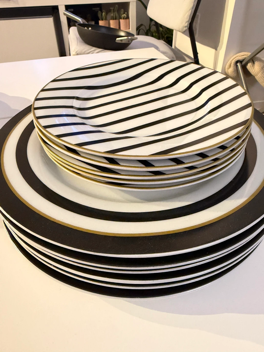 Selling a set of AmazonBasics plates with a stylish black and white design! There are two different patterns: one with concentric black rings and another with black stripes. Perfect for adding a modern touch to your dining table