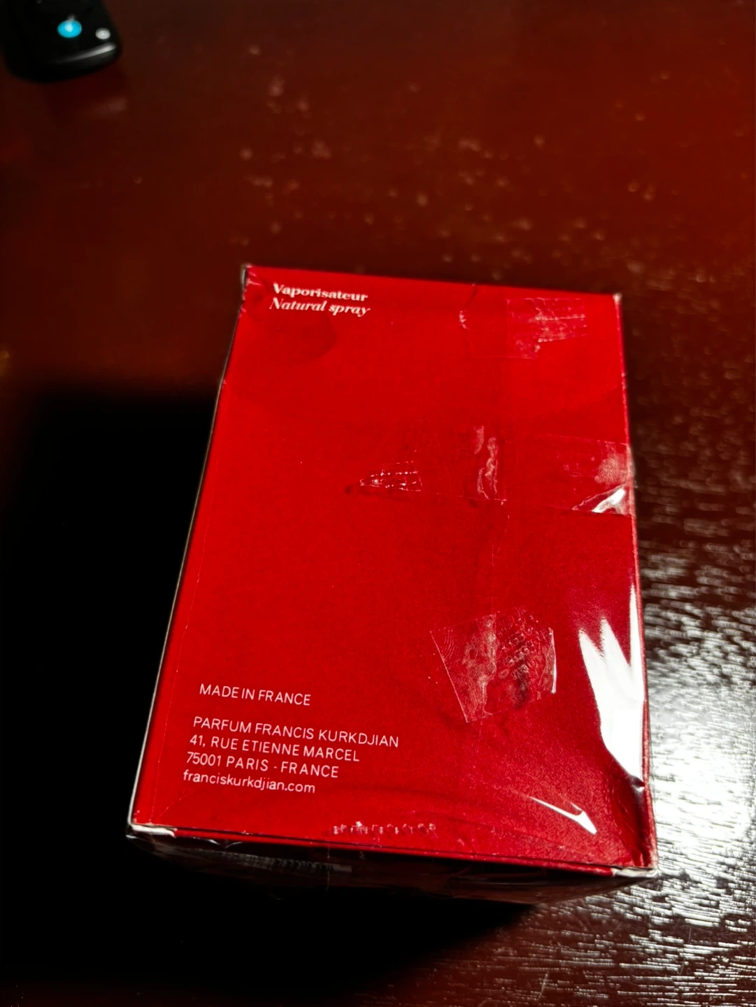 Maison Francis Kurkdjian Baccarat Rouge 540 Extrait de Parfum. Vaporisateur Natural spray. Made in France. 2.4 fl oz. It’s authentic. The packaging is a little messy since I opened it and then taped it back together other than that the cologne is good. And I’m ready to negotiate. Available delivery (price varies on location)