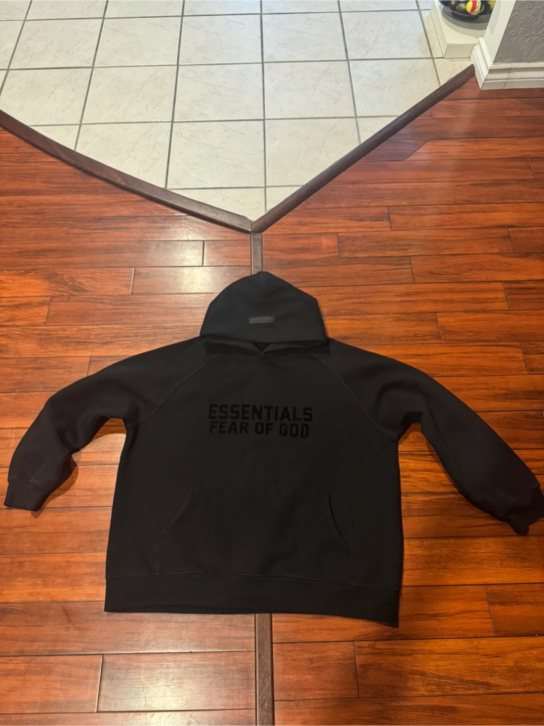 Black hoodie from Fear of God Essentials. It's a comfortable pullover style with a front pouch pocket. Made with a soft fabric blend.