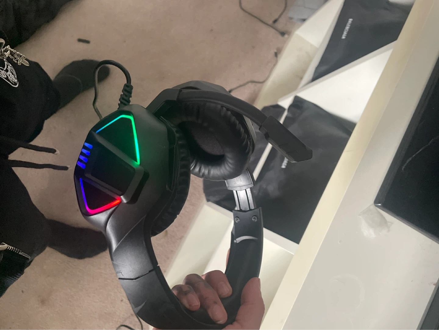 This is a gaming headset with adjustable RGB lighting. It features a built-in microphone and comfortable earcups. Perfect for immersive gaming sessions!