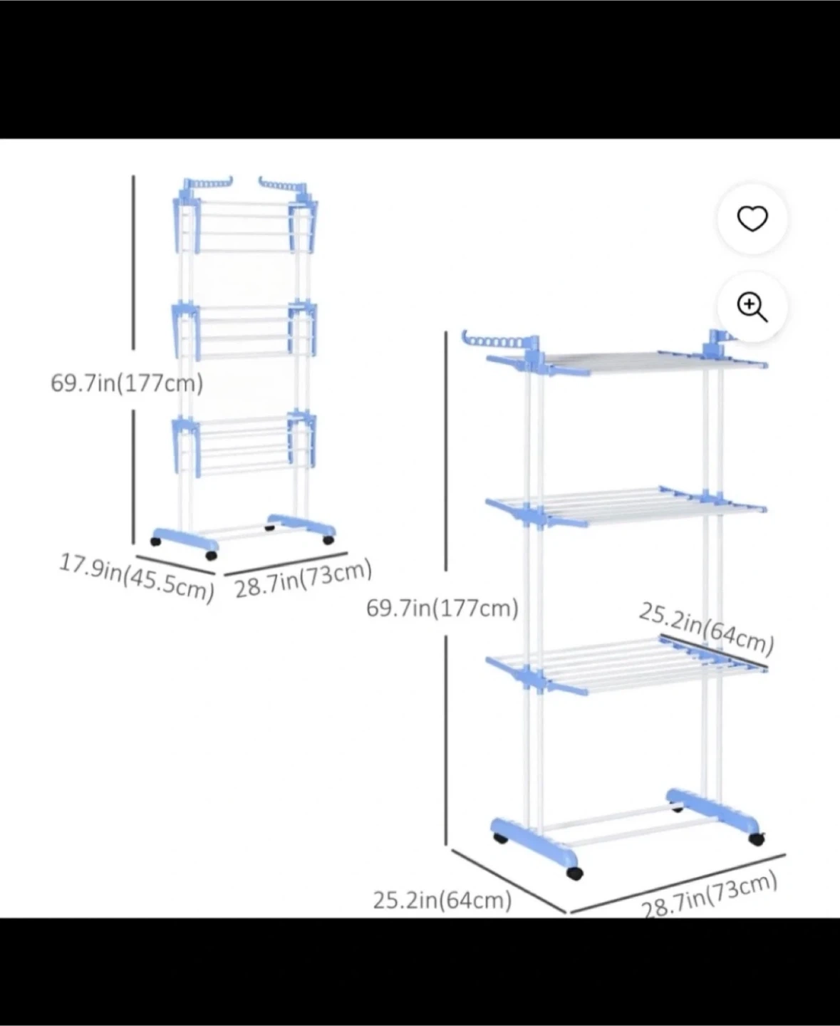 This is a 3-tier drying rack with wheels for easy moving. It measures 69.7 inches tall, 28.7 inches wide, and 17.9 inches deep. It's perfect for drying laundry indoors.