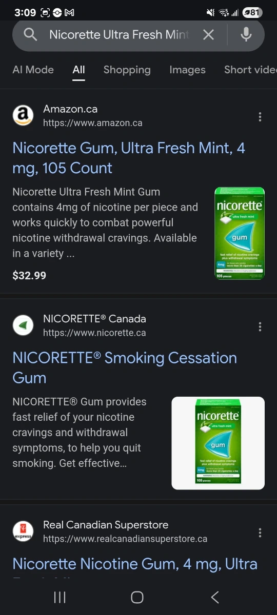 Buy & SellNicorette Ultra Fresh Mint 4mg. GumNicorette Ultra Fresh Mint 4mg. Gum$20x1 Nicorette Ultra Fresh Mint 4mg 105 pieces $20 10 / 2027WHERE TO MEETCheck LocationView MapSELLERHunterSouth Cambie887 reviews1 chats·1 favorites·14 viewsSEND CHAT TO SELLERHi Hunter! I’m interested in your listing.Hi Hunter! I’m interested in your listing.Get the Karrot app to chatSign In to chat