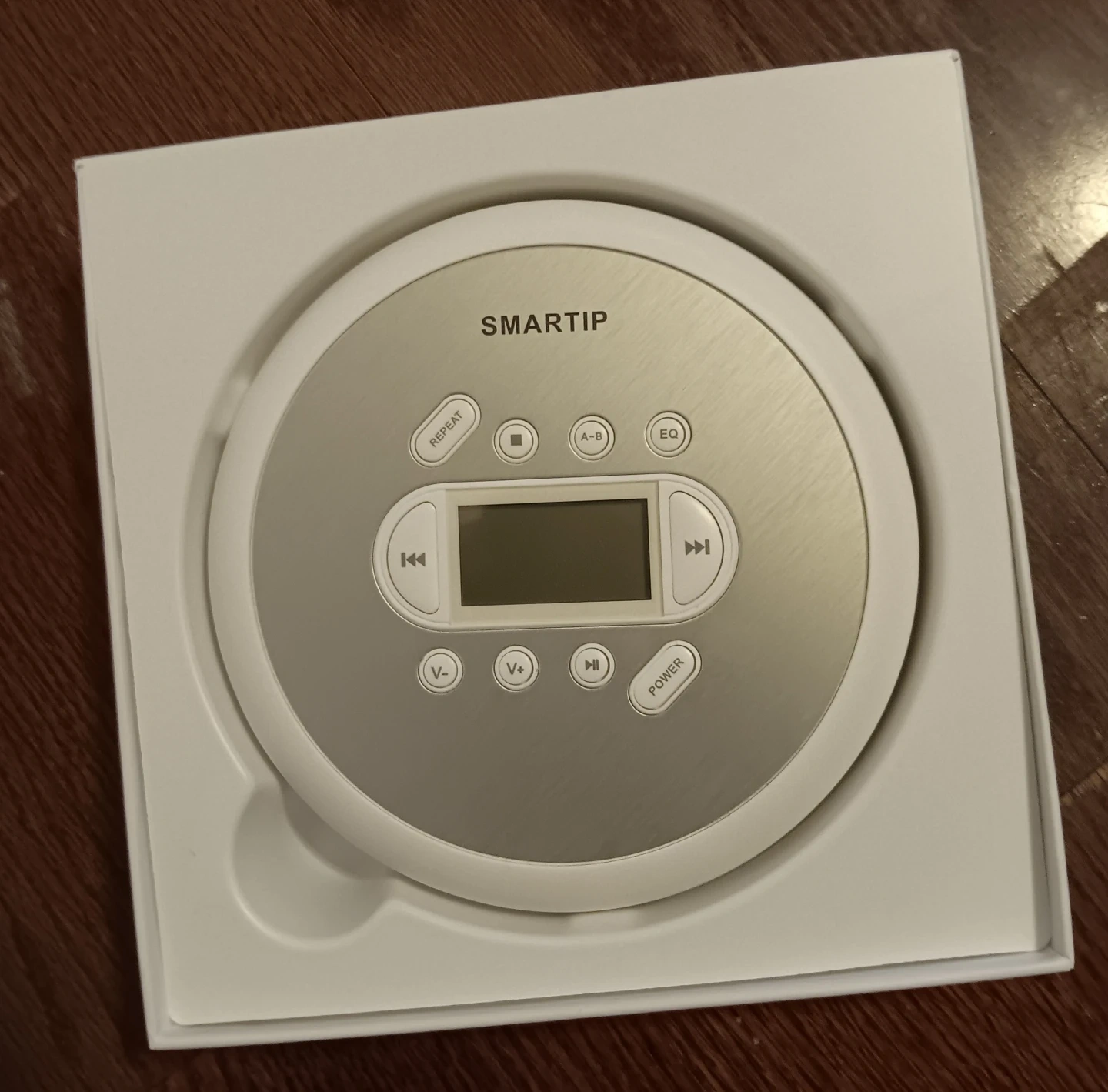 SMARTIP portable CD player. Includes EQ and repeat functions. It's powered by AA batteries or AC adapter (not included).