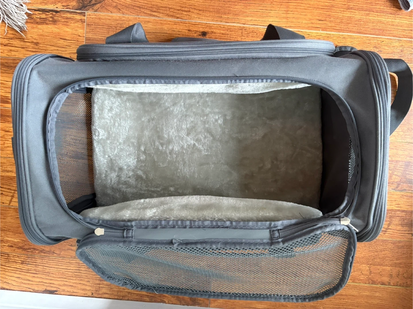 Barely used. This is a grey Jet Sitter pet carrier bag with mesh side extensions for extra space and ventilation. The extensions have zippers for easy exits. It has a soft interior mat for your pet's comfort, with a bottom removable piece for easy cleanup. The carrier includes both top handles and a detachable shoulder strap.