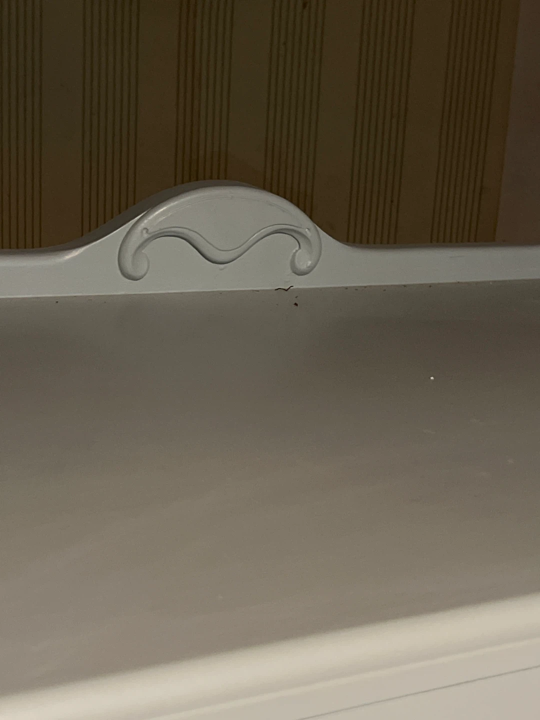 This light grey painted solid wood dresser has four drawers and decorative trim. The dresser itself measures about 36 inches in width and 44 inches in height. Silver hardware.