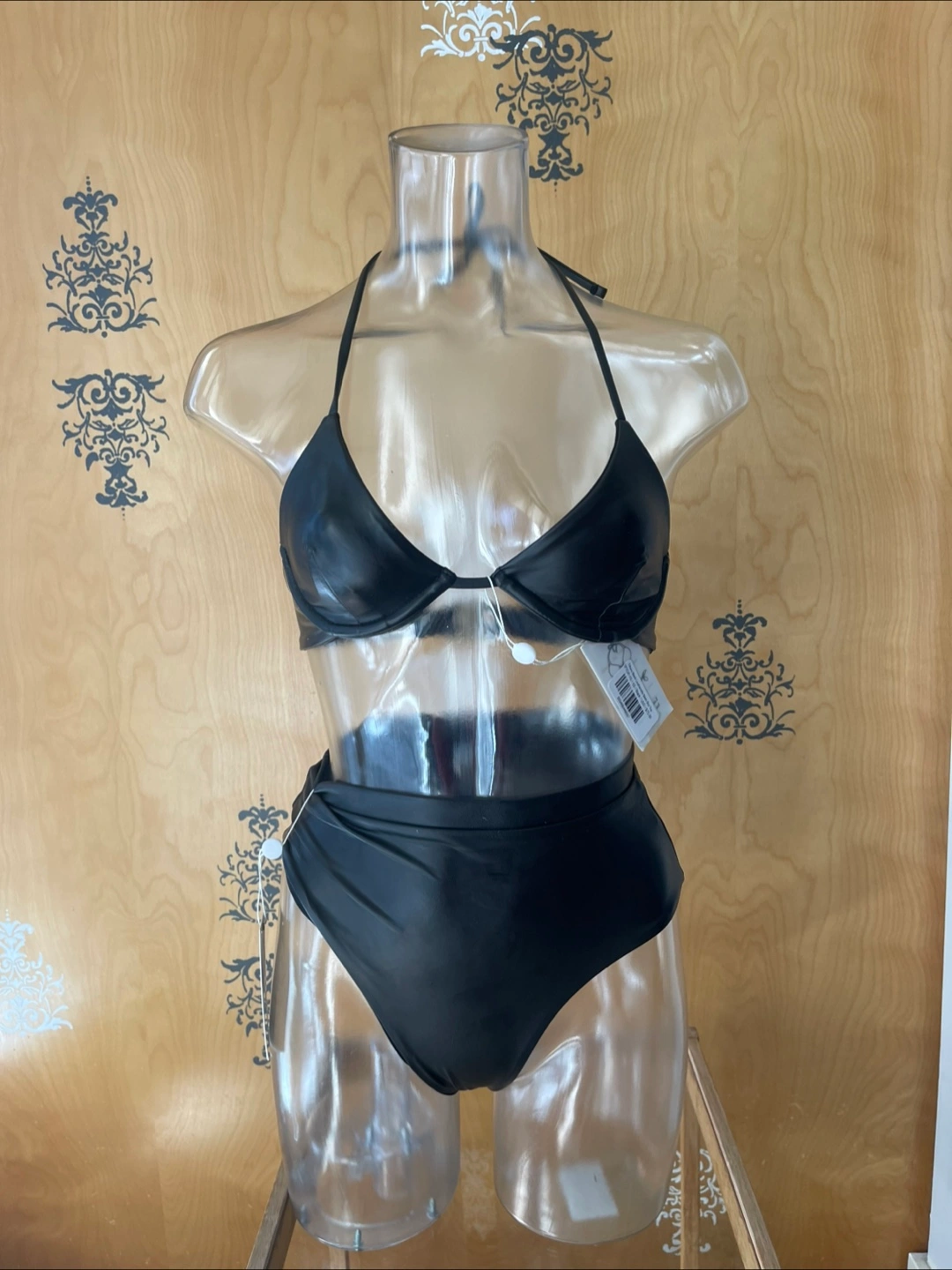 NWT Black Pleather Bikini Set Underwire Halter Top High Waisted Bottoms XS