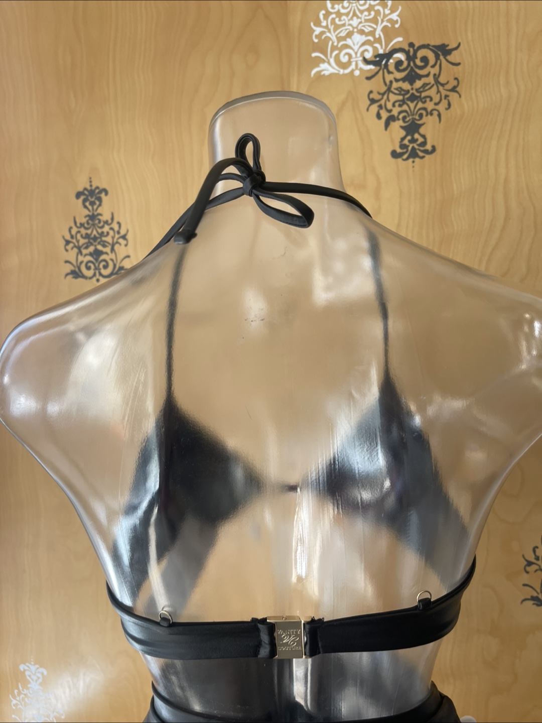 Closure: Adjustable halter strings & secure gold back buckle