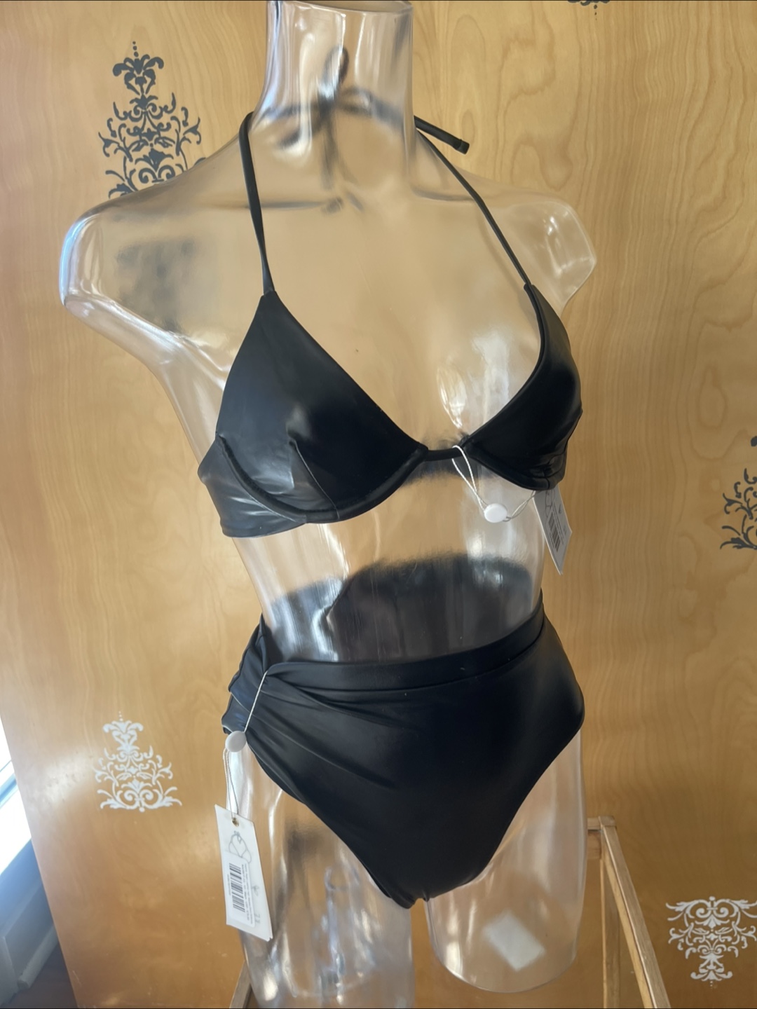 NWT Black Pleather Bikini Set Underwire Halter Top High Waisted Bottoms XS
