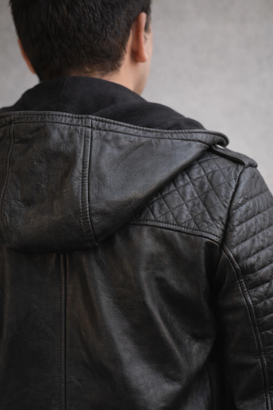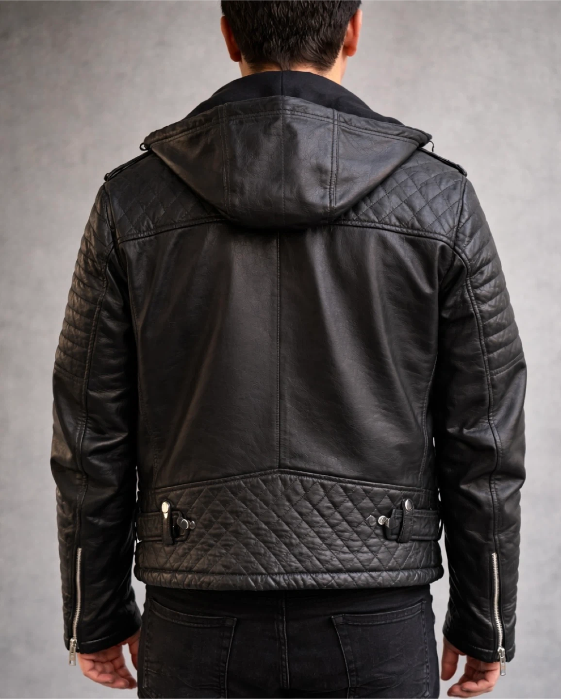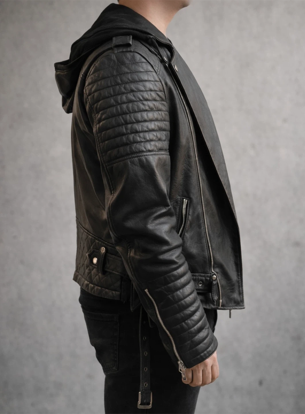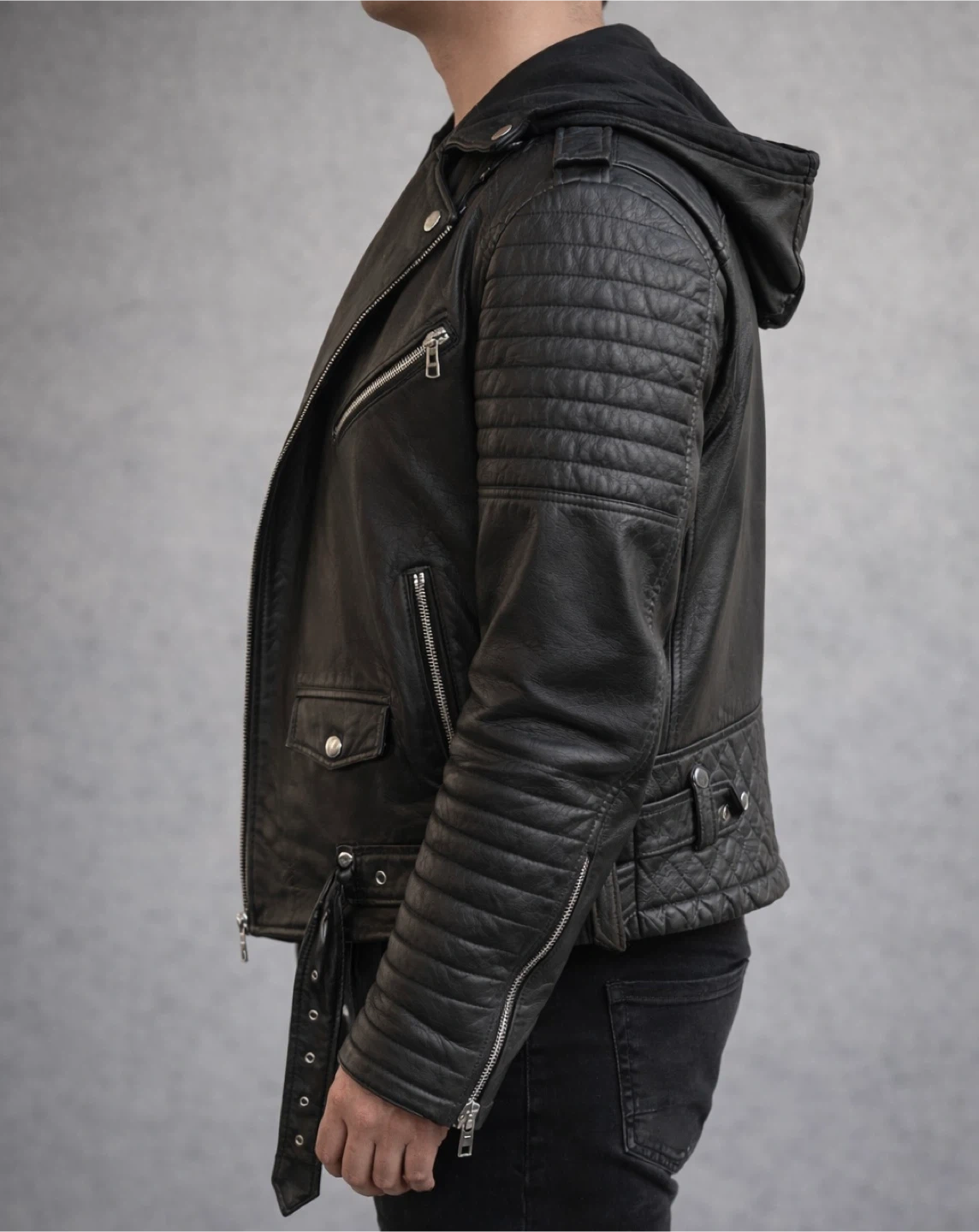 Biker style with quilted shoulders and sleeves. Features an asymmetrical front zipper, multiple zip pockets, adjustable waist belt, and a removable hood.