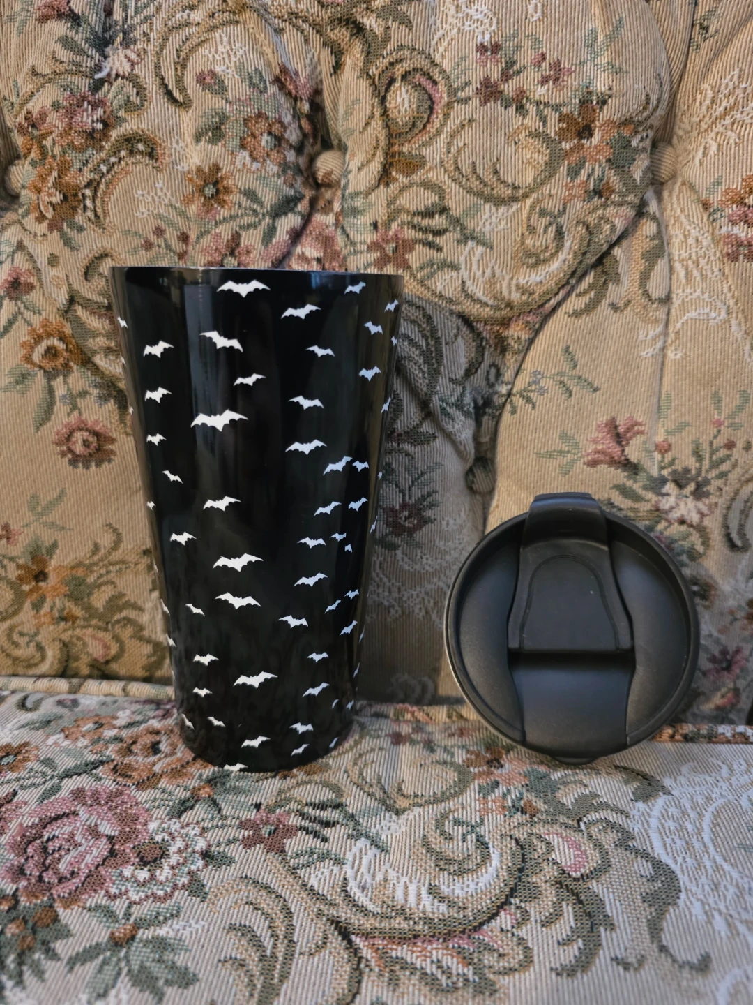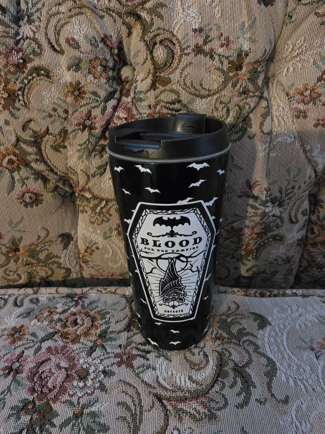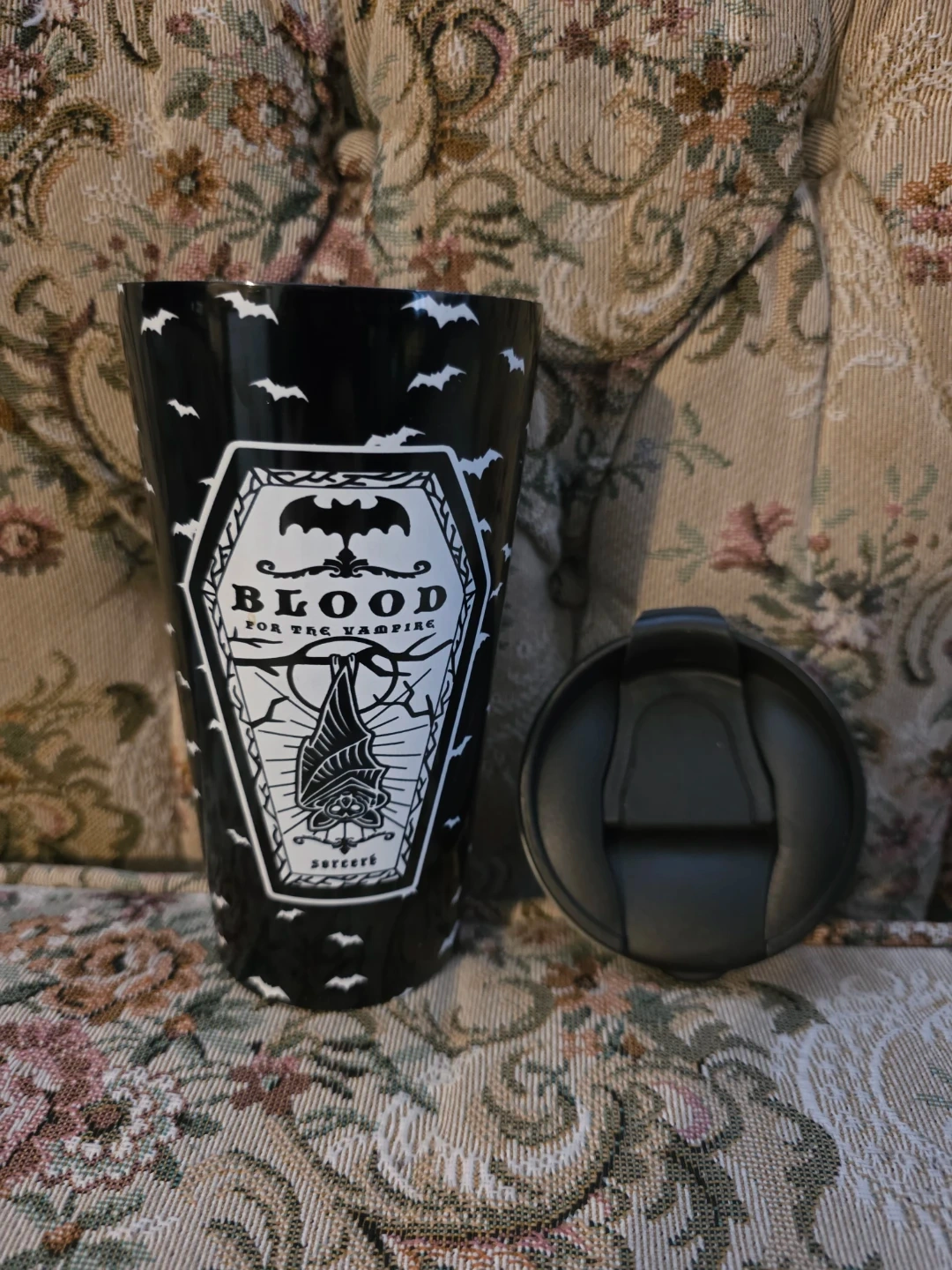 Selling a metal tumbler with a spooky coffin and bat design! It features a black background with white bat accents and a graphic that says "Blood For The Vampire". Perfect for anyone who loves a bit of gothic flair in their drinkware