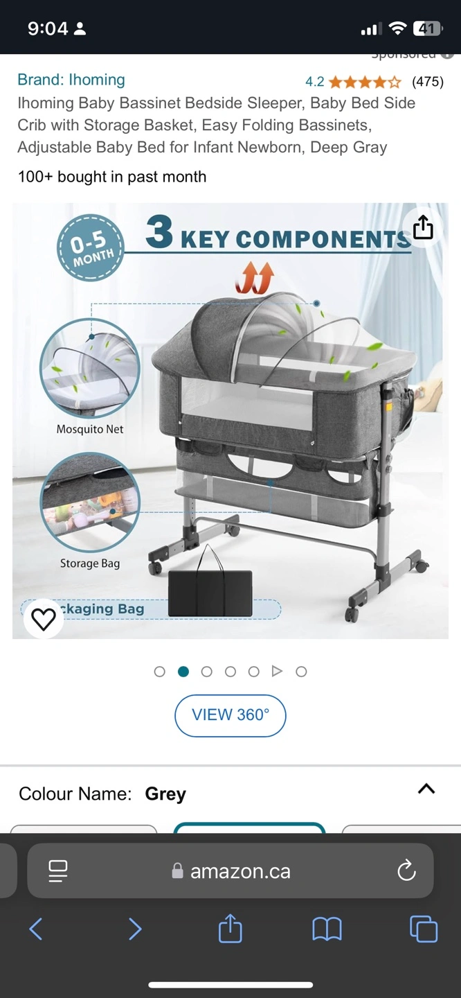 Grey baby bassinet with storage basket, easy folding, adjustable height. Includes mosquito net and storage bag.