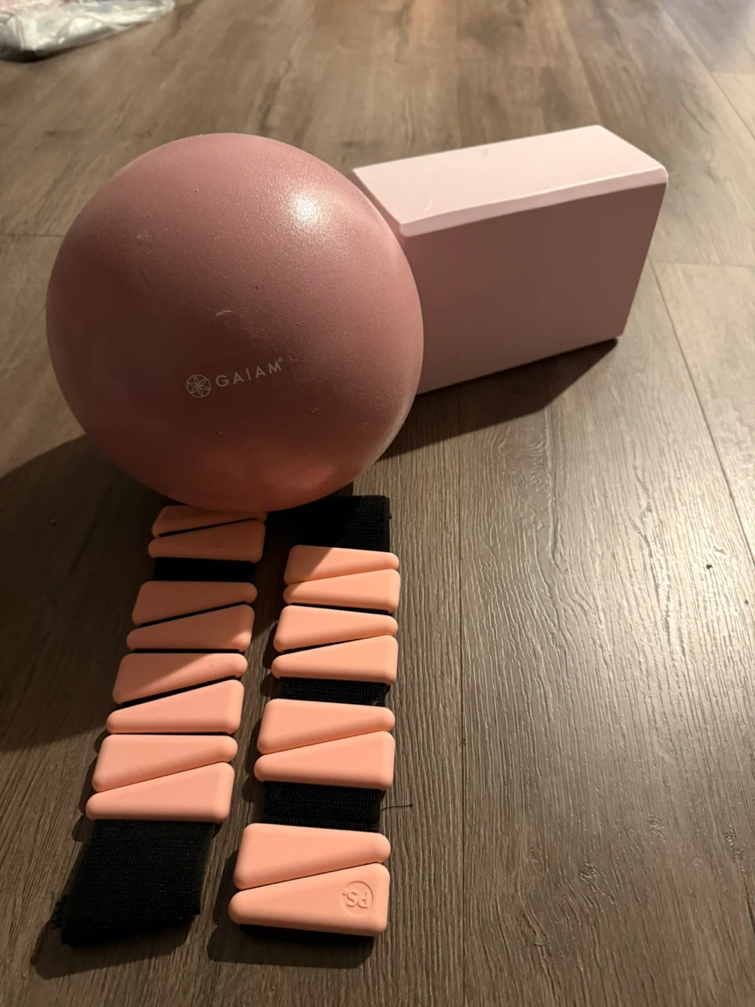 Includes a Gaiam pink yoga block and ankle/wrist weights.