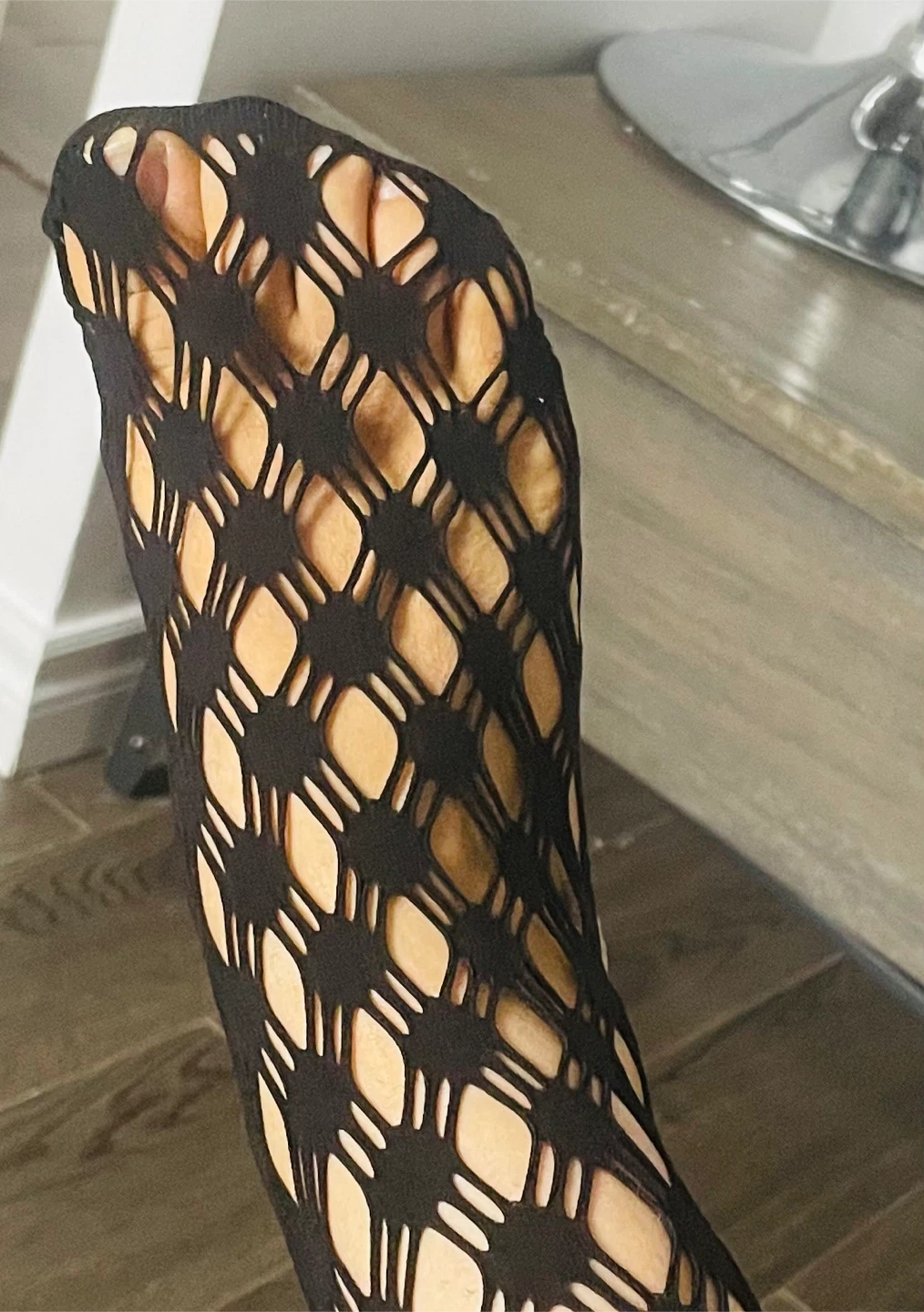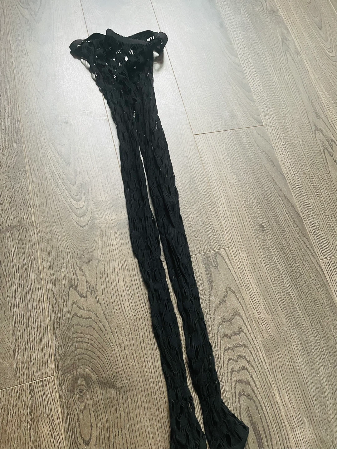 Black fishnet tights with a diamond pattern. These tights offer a stretchy fit and a bold look. They're great for layering or making a statement. Material is nylon blend.
