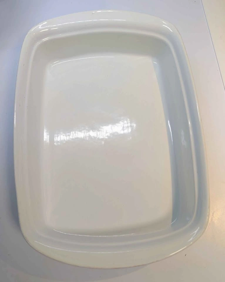 This lasagna pan is in excellent condition with no chips or scratches. It has been used, and a few very small bits of baked-on grease remain after scrubbing.