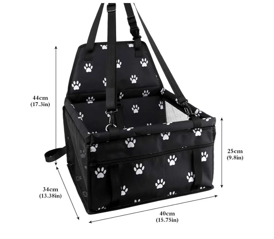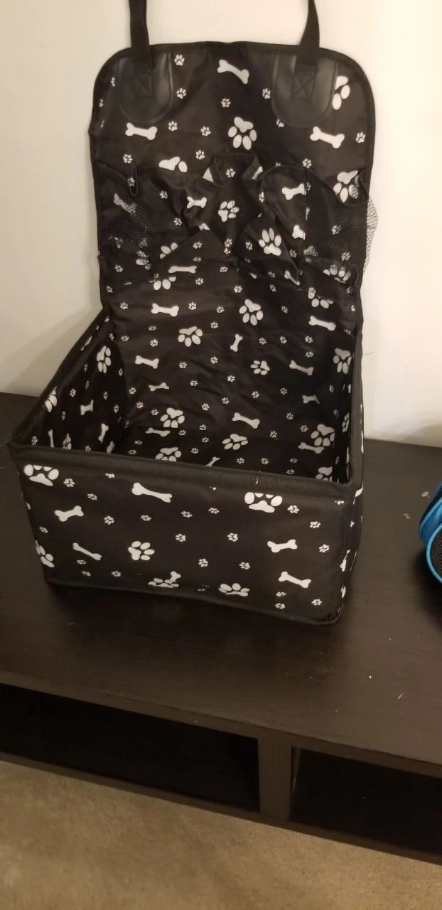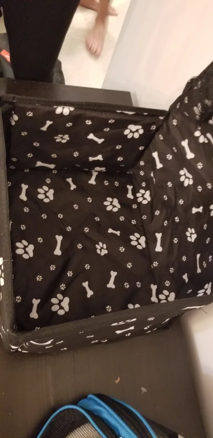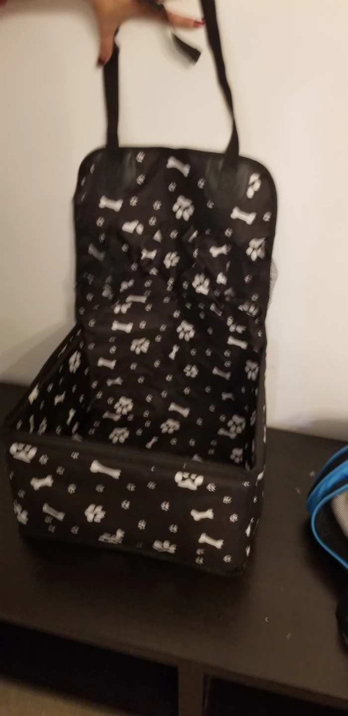 This pet car seat carrier is perfect for keeping your furry friend safe and comfortable on car rides! It features a stylish black design with white paw prints and bones. It looks like it's in great condition and ready for a new home!