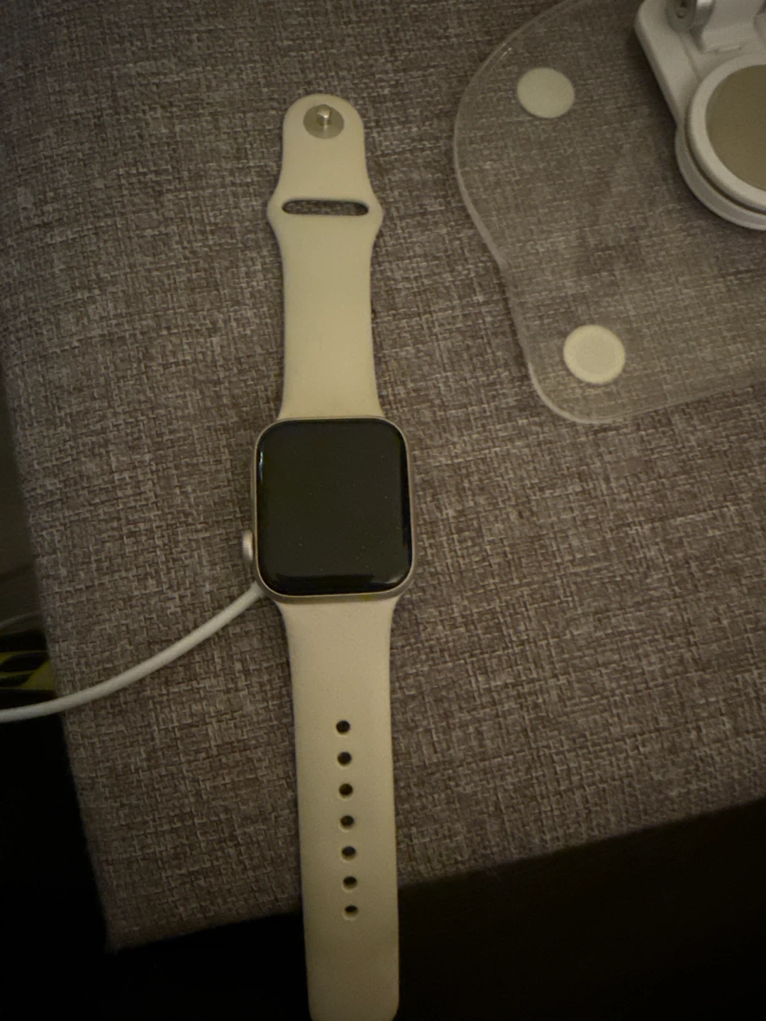 Apple Watch SE in silver with a cream band. It's a 44mm model. This smartwatch is in great condition and ready for a new owner!