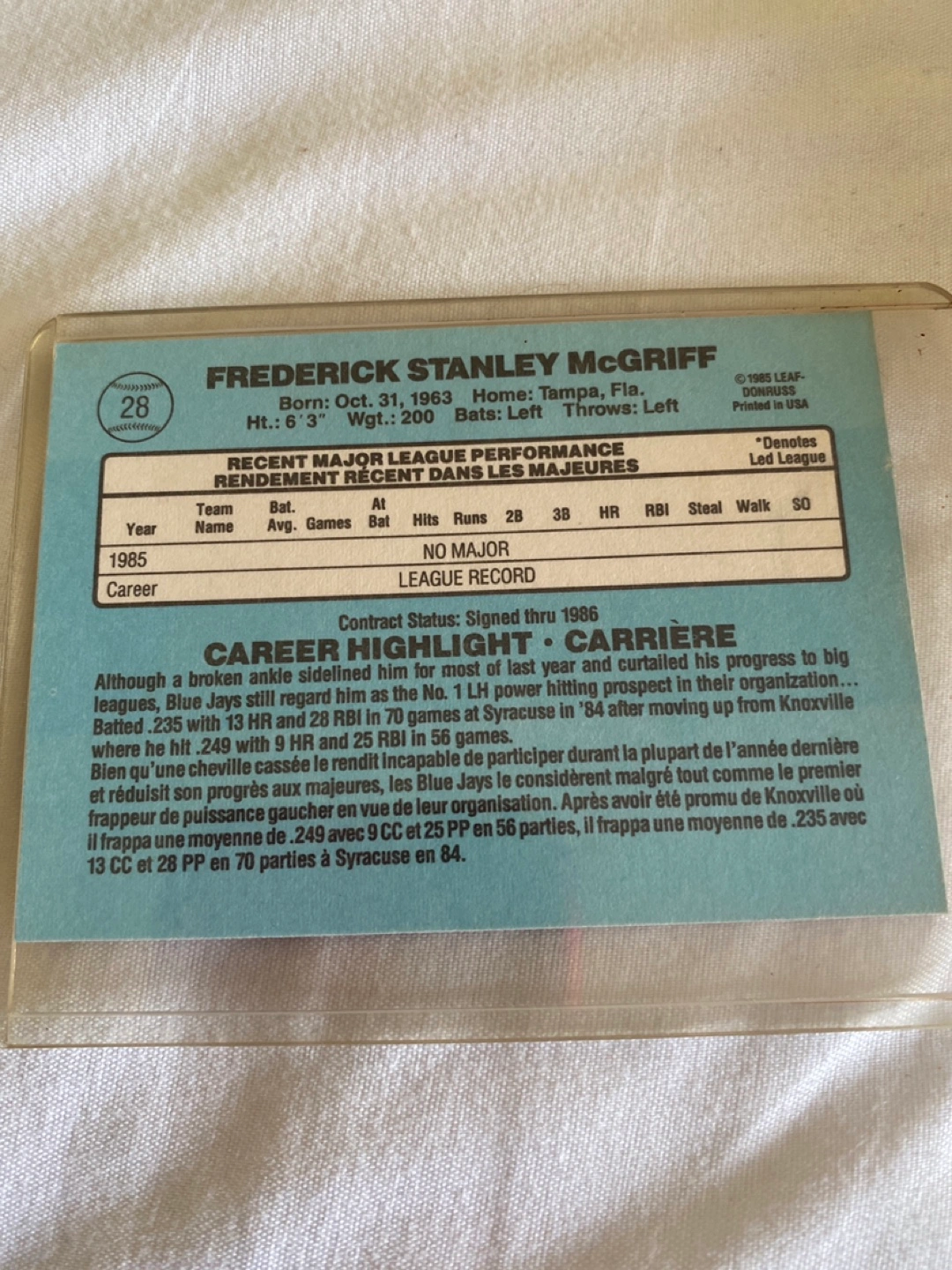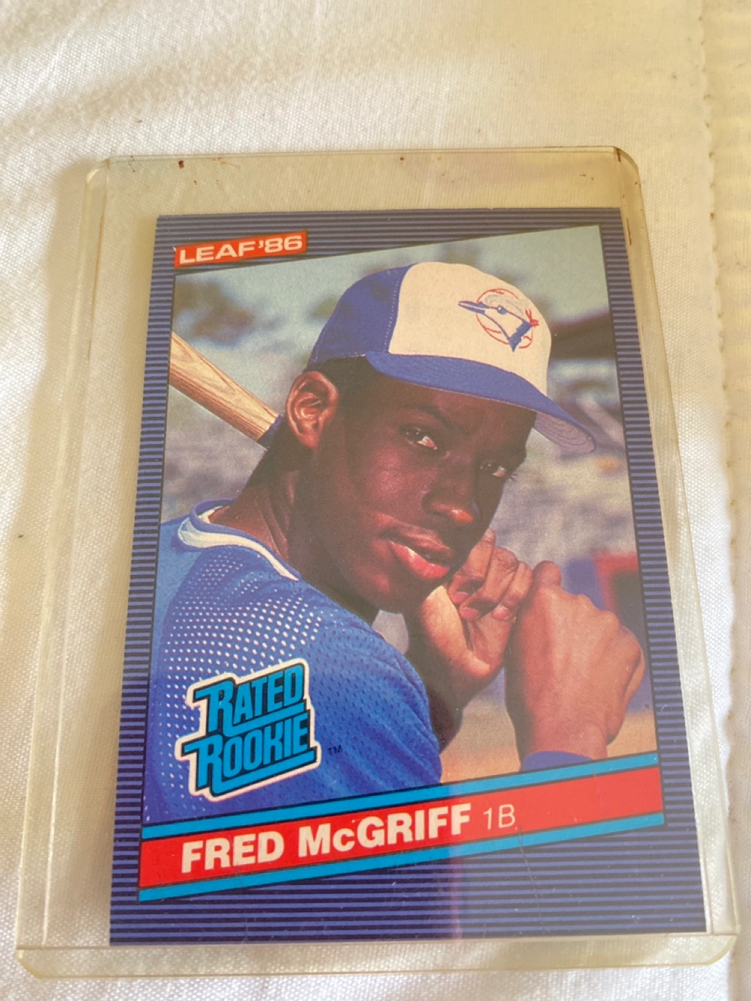 Vintage Fred McGriff baseball card. Leaf Rated Rookie card. In a plastic protector. Shows some wear.