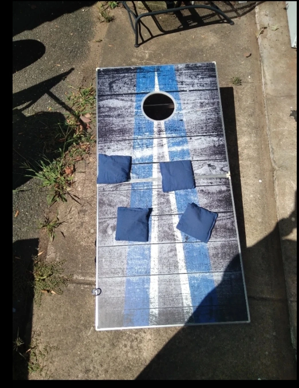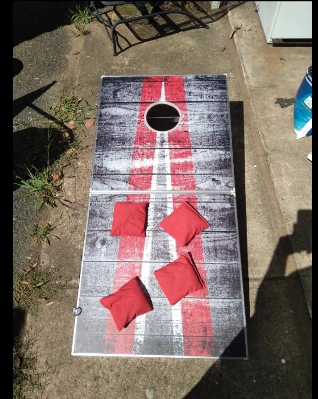 This is a foldable cornhole set with two boards, one featuring a blue stripe design and the other a red stripe design. It includes 8 bean bags, 4 blue and 4 red. The boards have a distressed wood look and are housed in a silver aluminum case for portability. This set is great for outdoor gatherings and parties!