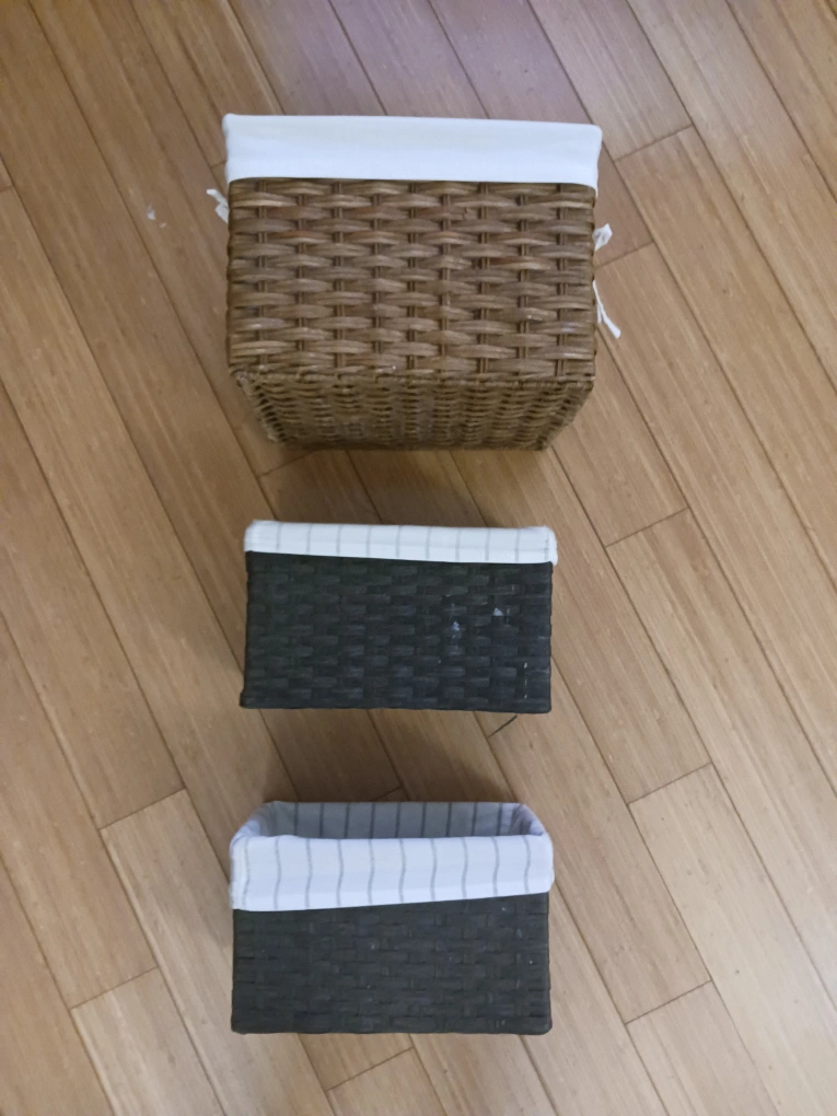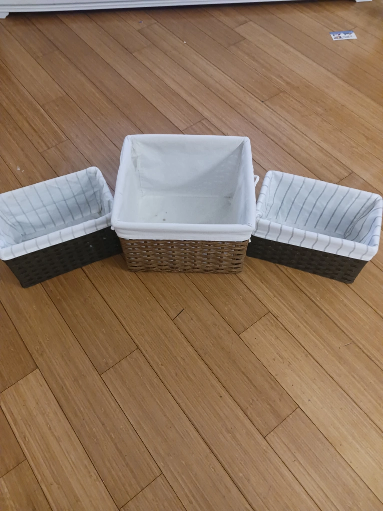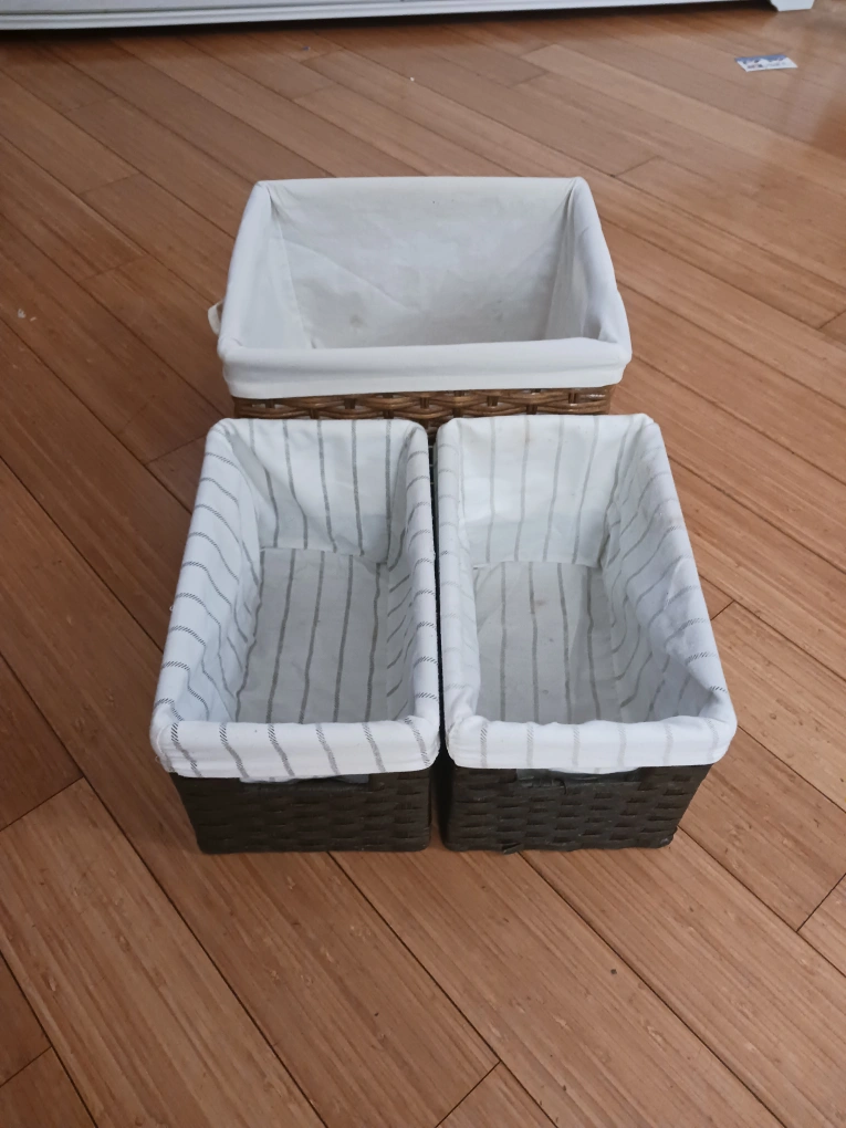 Bundle includes 1 large woven basket and 2 matching smaller ones with removable cloth liners. All in good condition and perfect for organizing clothes, towels, toys, or general home storage. As a bonus, you’ll also get a small round woven basket for free!