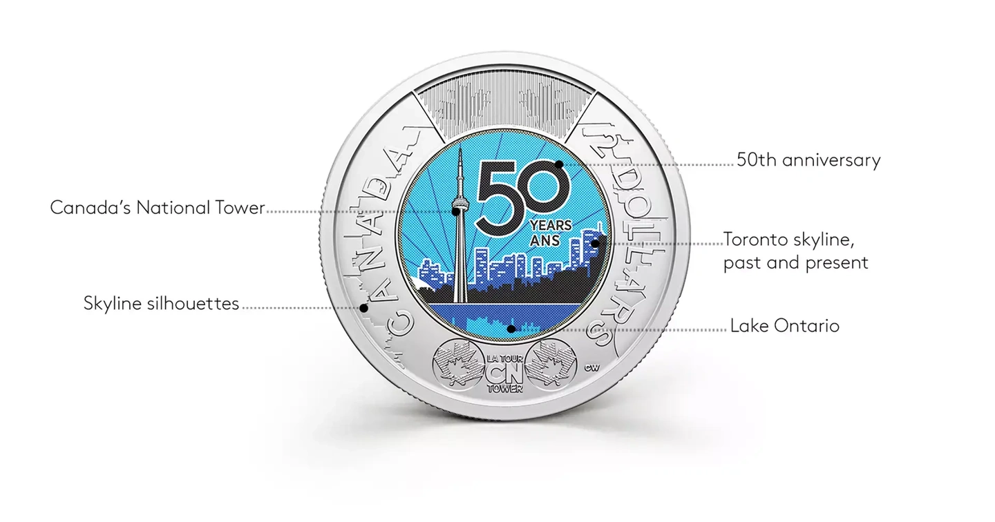 Keep reading to learn more about the design details behind the 2026 50th Anniversary of the CN Tower commemorative $2 circulation coin.