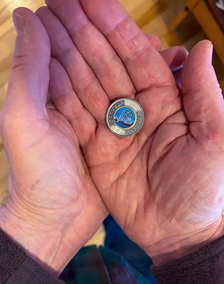 Want to make your coloured CN Tower coin glow? Expose the coin to natural light or hold it under an ultraviolet light source like a UV flashlight (your phone flashlight won’t do the trick), turn off the lights, and watch your coin glow to life!