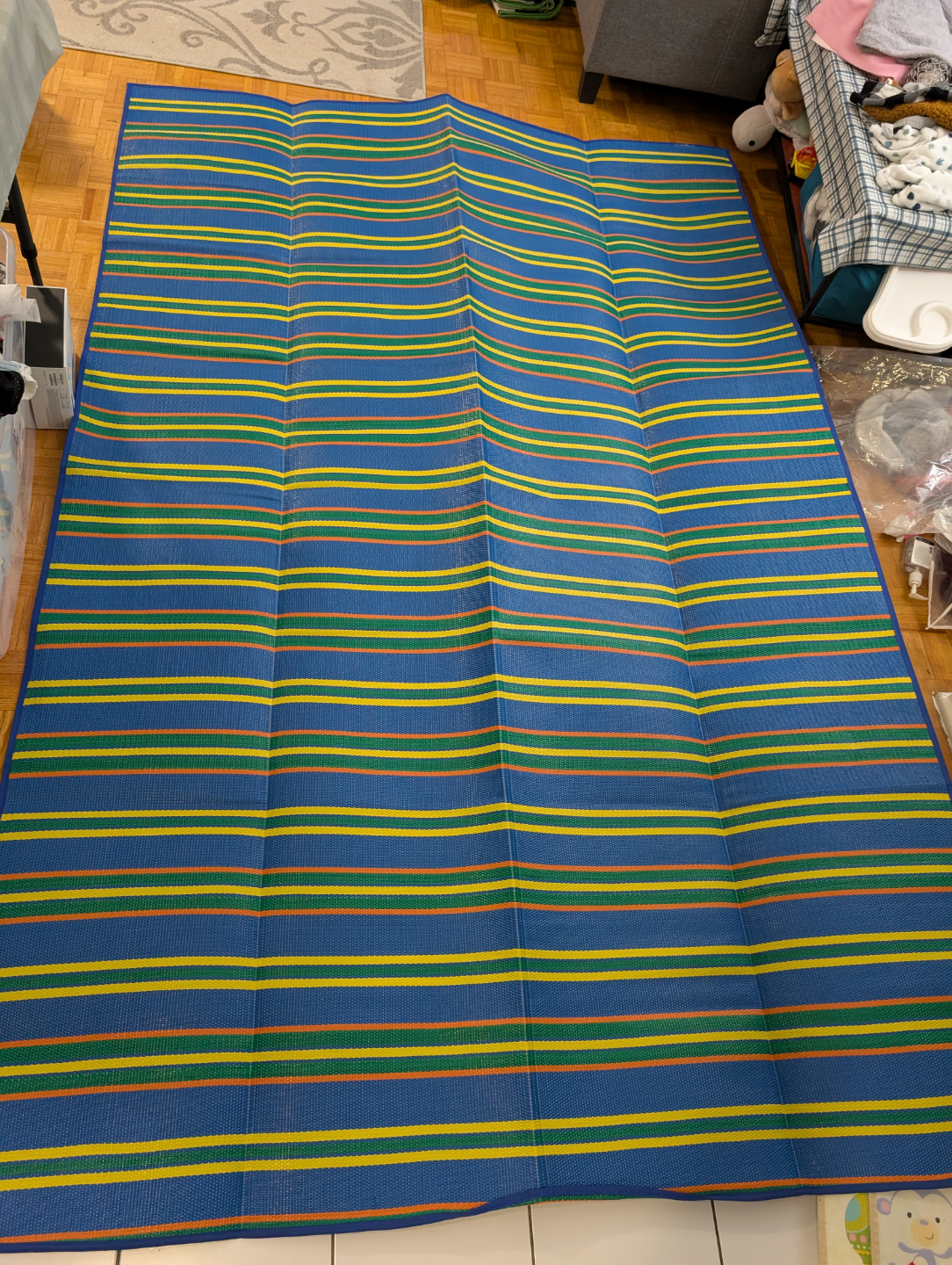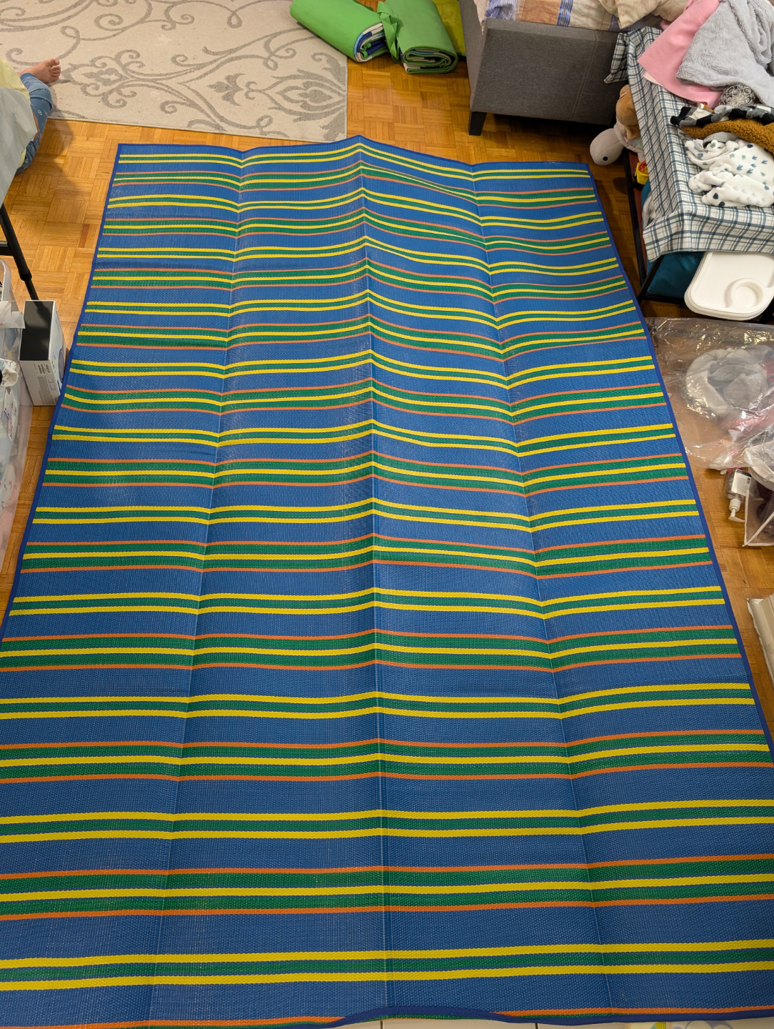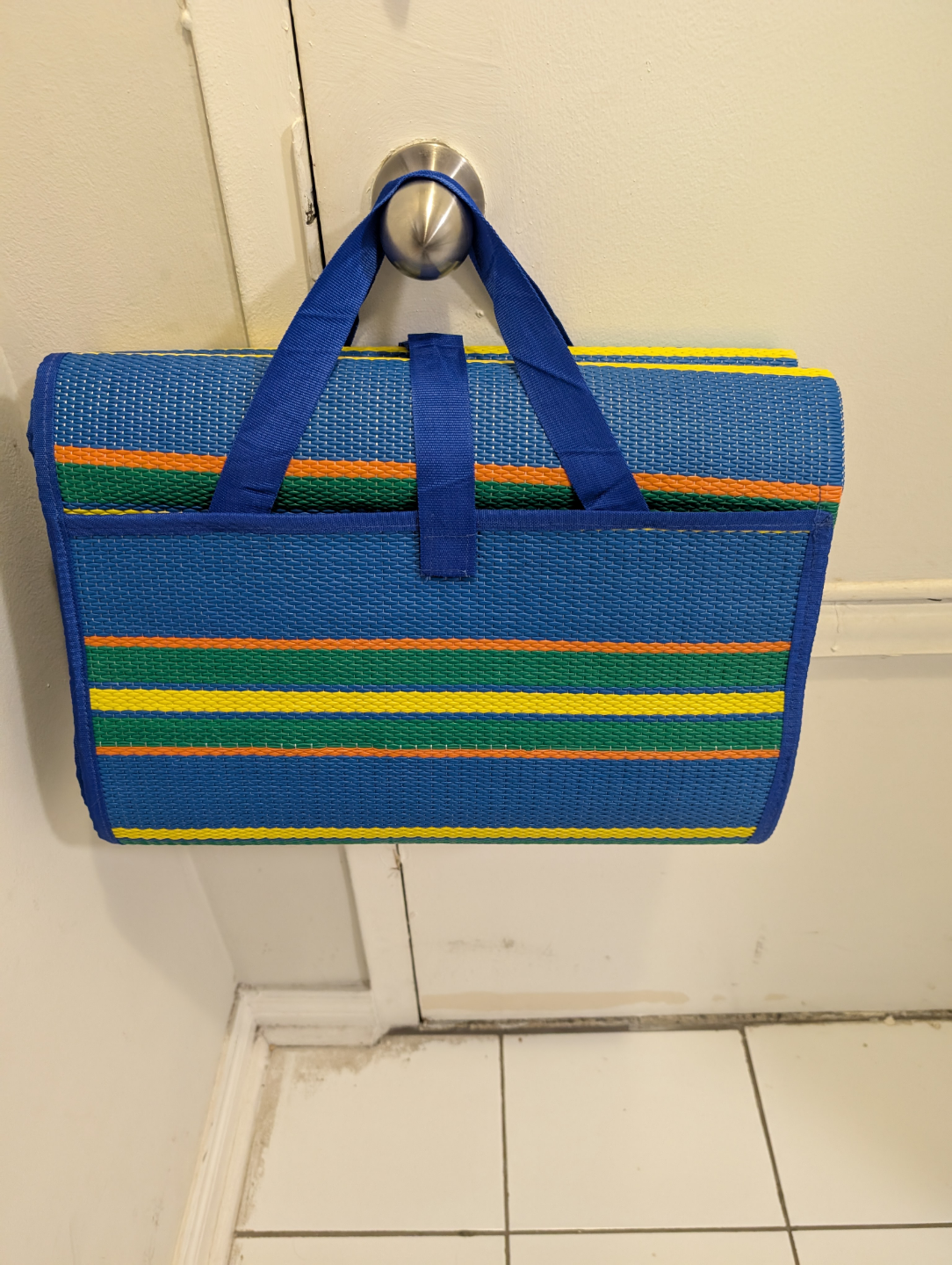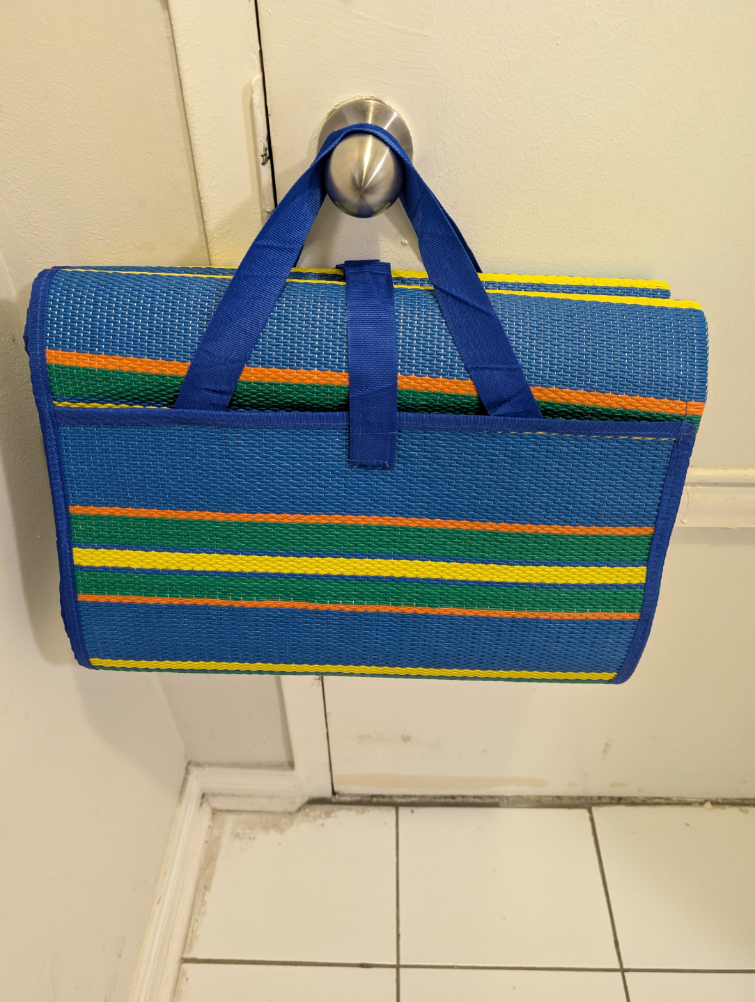 Outdoor mat. Blue with multi-coloured stripes. Made of a woven material. Perfect for picnics.Totally new.Never used.Size is 72 inch width and 108 inch length.Price is negotiable.Easy to carry.Have pouch bag attached to carry.Good for camping and picnic.