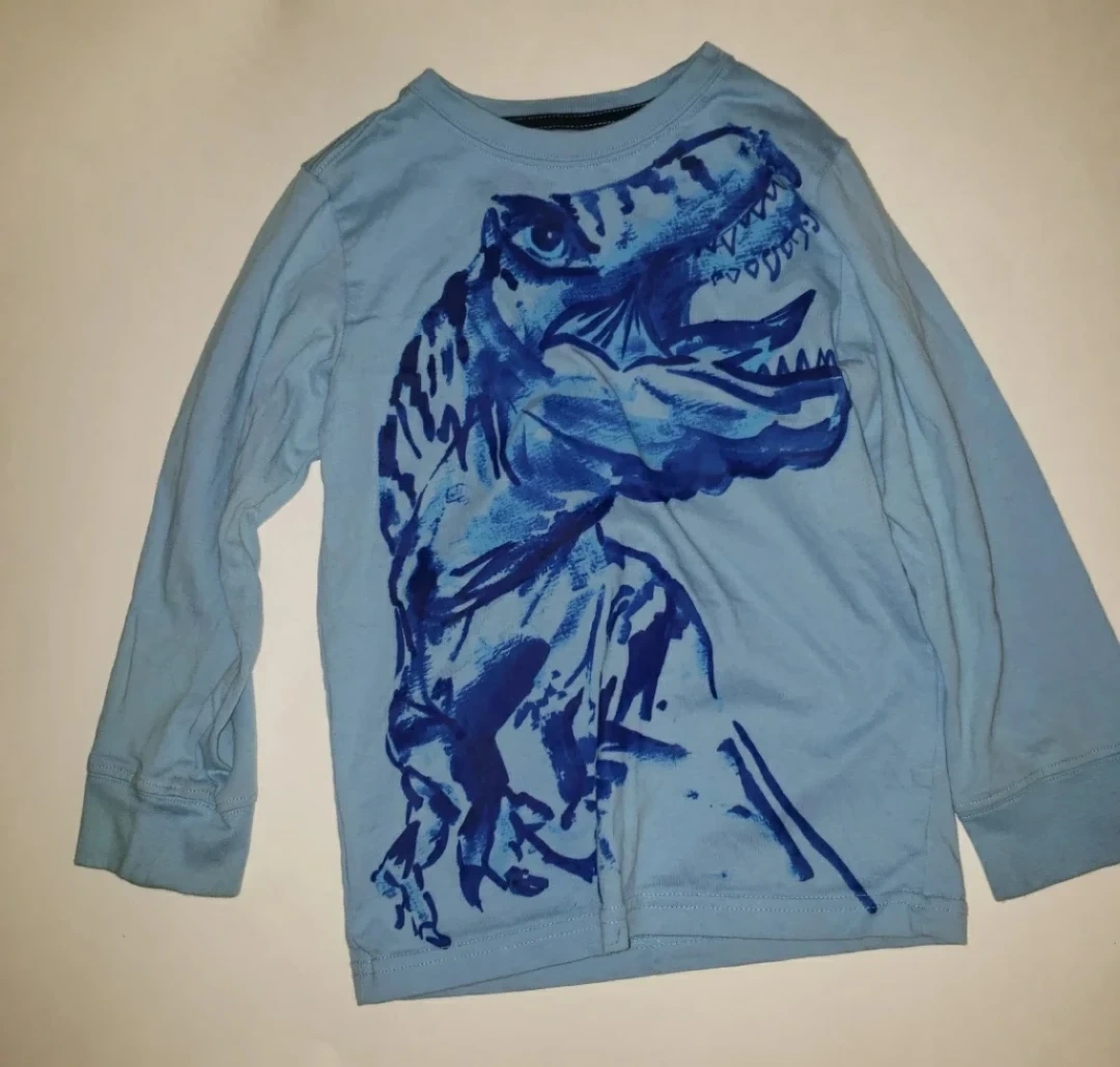 Blue long sleeve t-shirt with a dinosaur graphic on the front. it has a stain on on the right sleeve that can probably be removed with stain remover.