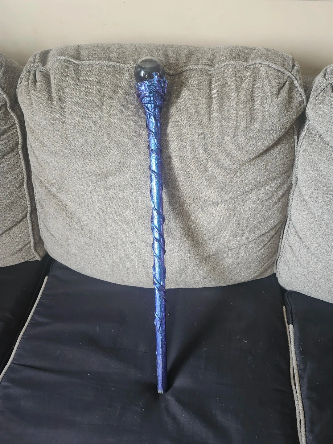 This staff has a skull design at the top with a crystal ball. It's painted in a vibrant blue with a twisted vine detail. Perfect for costumes or displays!