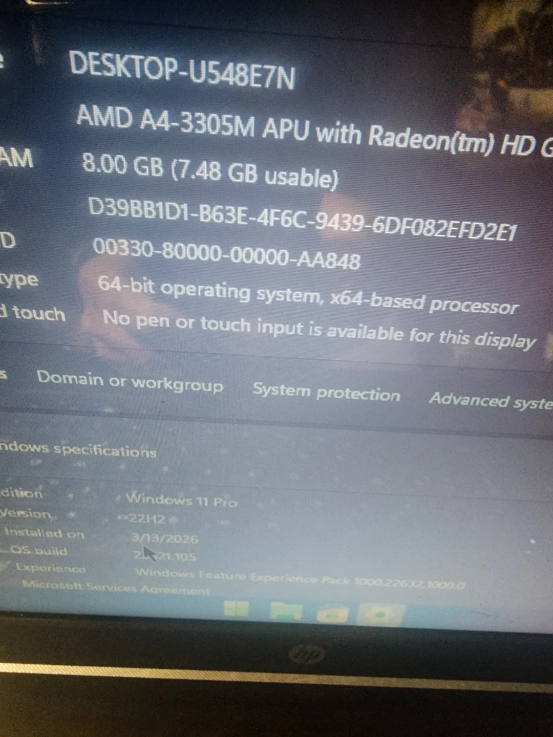 This HP Pavilion g6 laptop runs on an AMD A4-3305M APU with Radeon HD graphics. It comes with 8 GB of RAM and a 120 GB storage drive. The operating system is Windows 11 Pro. Great for everyday tasks!