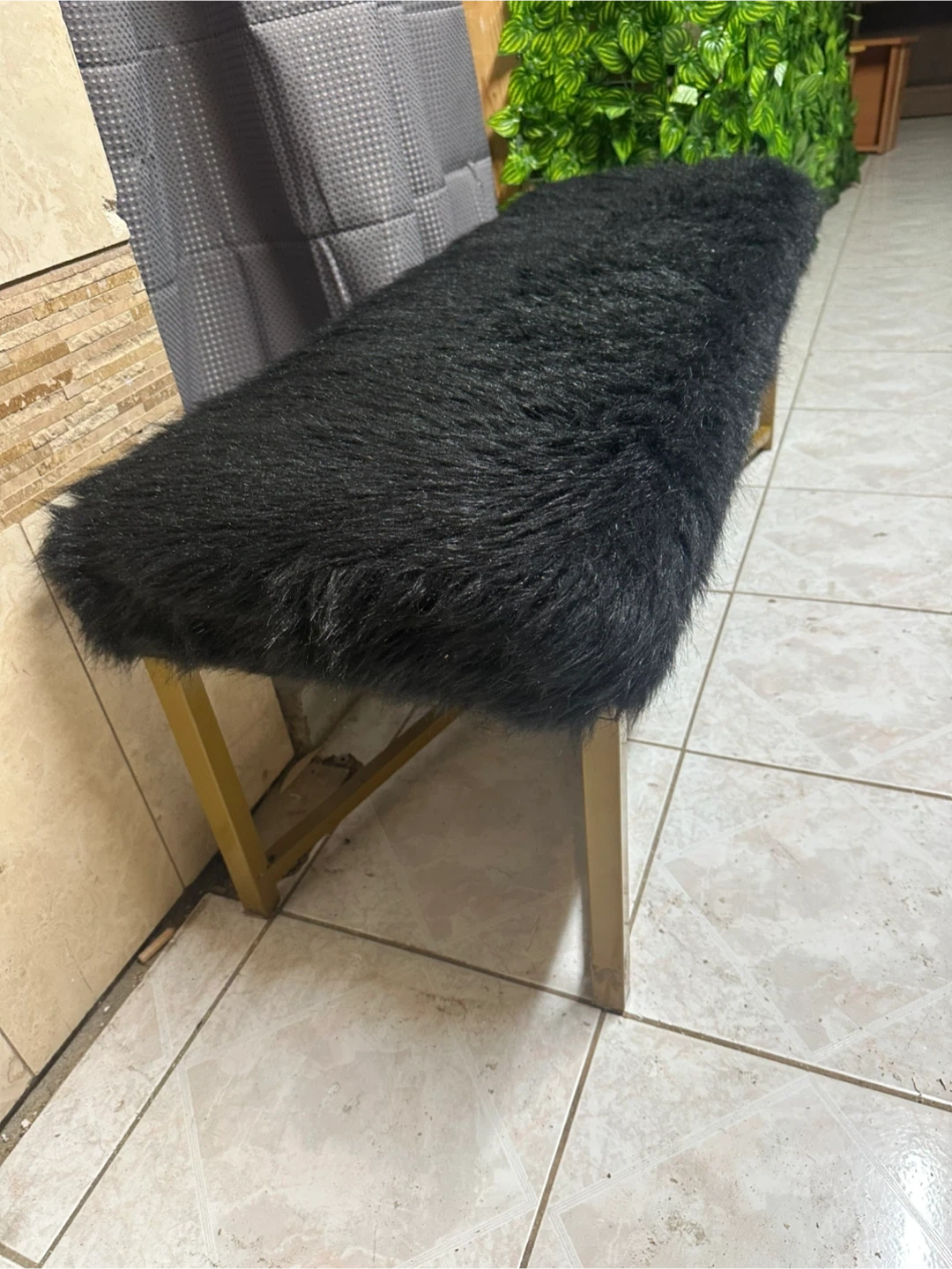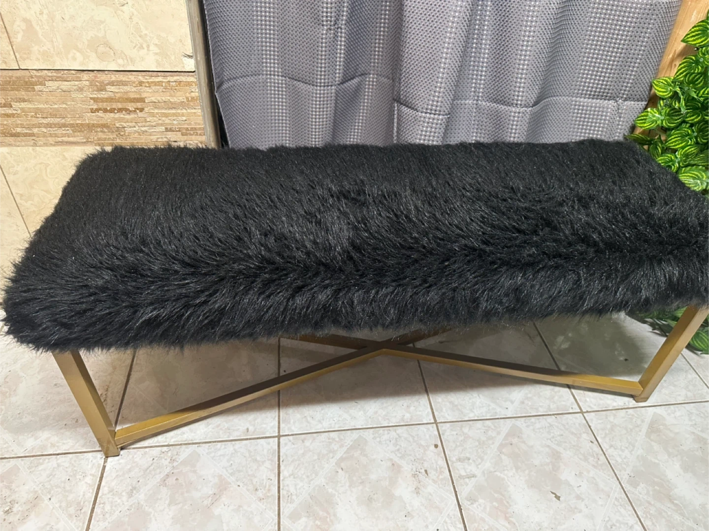 Black Faux Fur Bench with Gold X-Leg Base