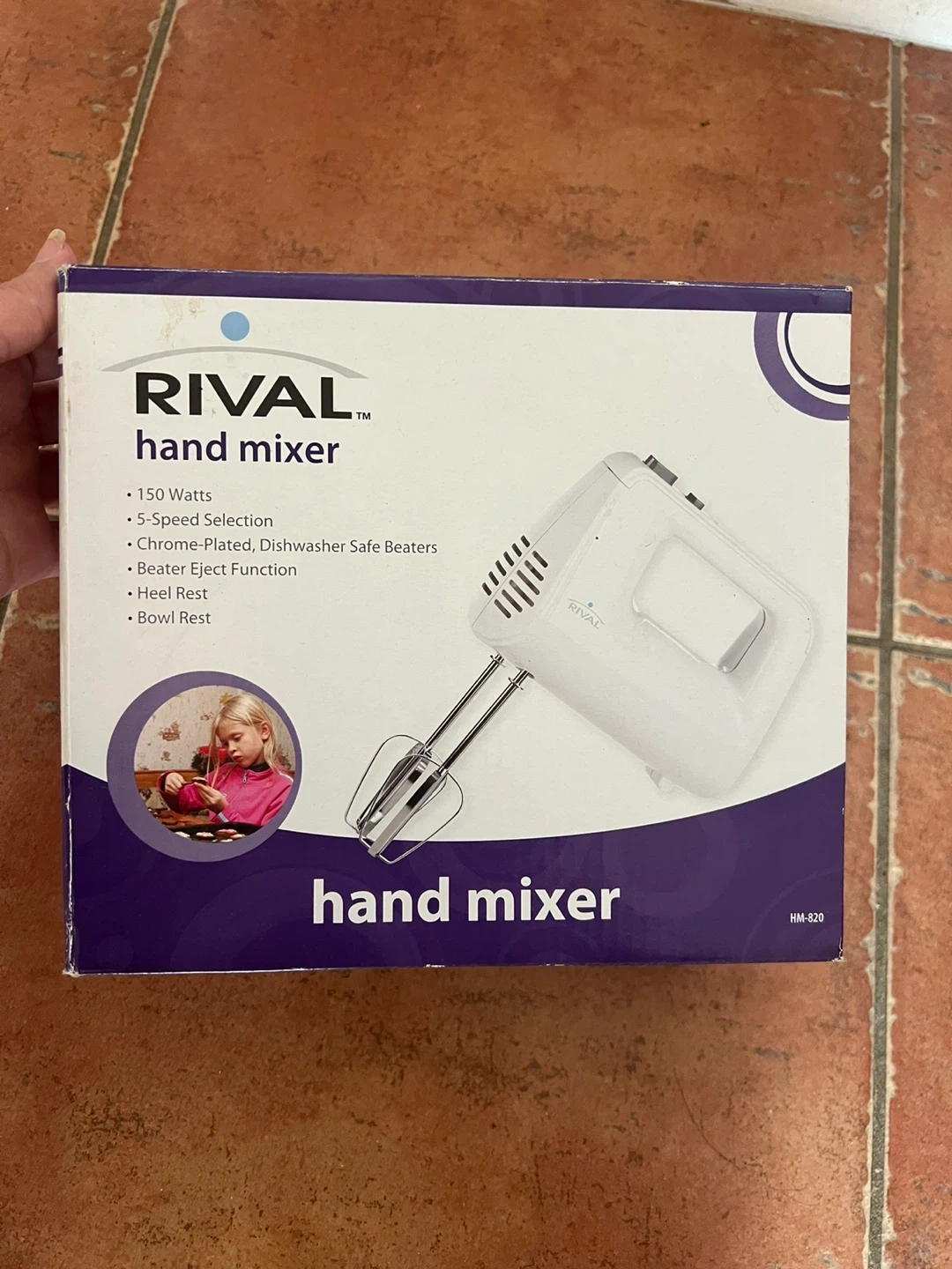 Selling a Rival hand mixer, model HM-820. It's 150 watts with 5-speed selection. The beaters are chrome-plated and dishwasher safe! It also features a beater eject function, heel rest, and bowl rest
