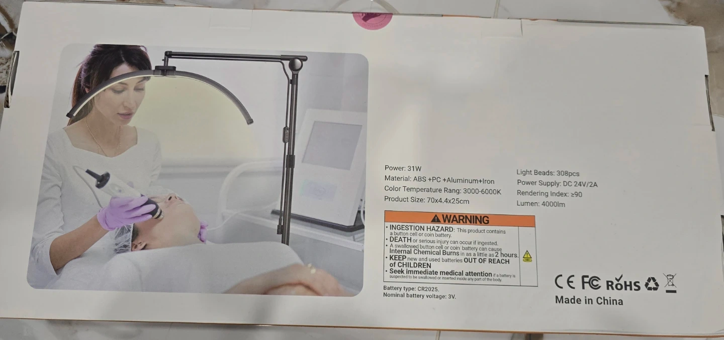 This is a floor foldable beauty nail lamp, model F-700B. It's made from ABS+PC+Aluminum+Iron. The product size is 70x4x4cm. It has a Lumen output of 4000lm and a power supply of DC 24V/2A. This lamp is useful for professional beauty treatments.