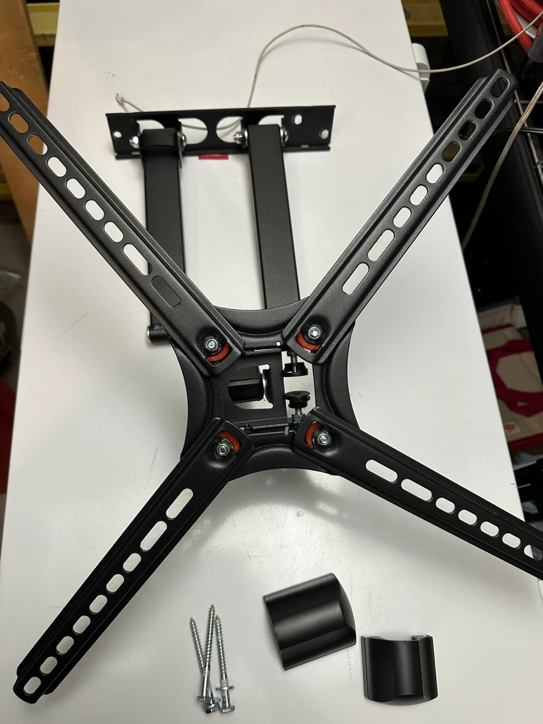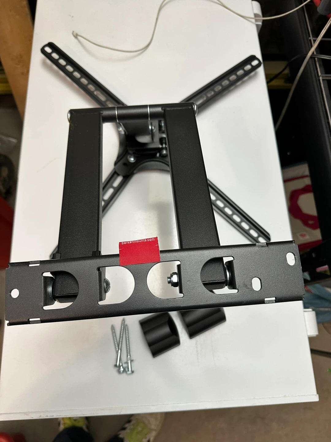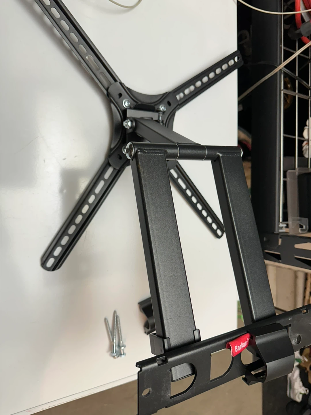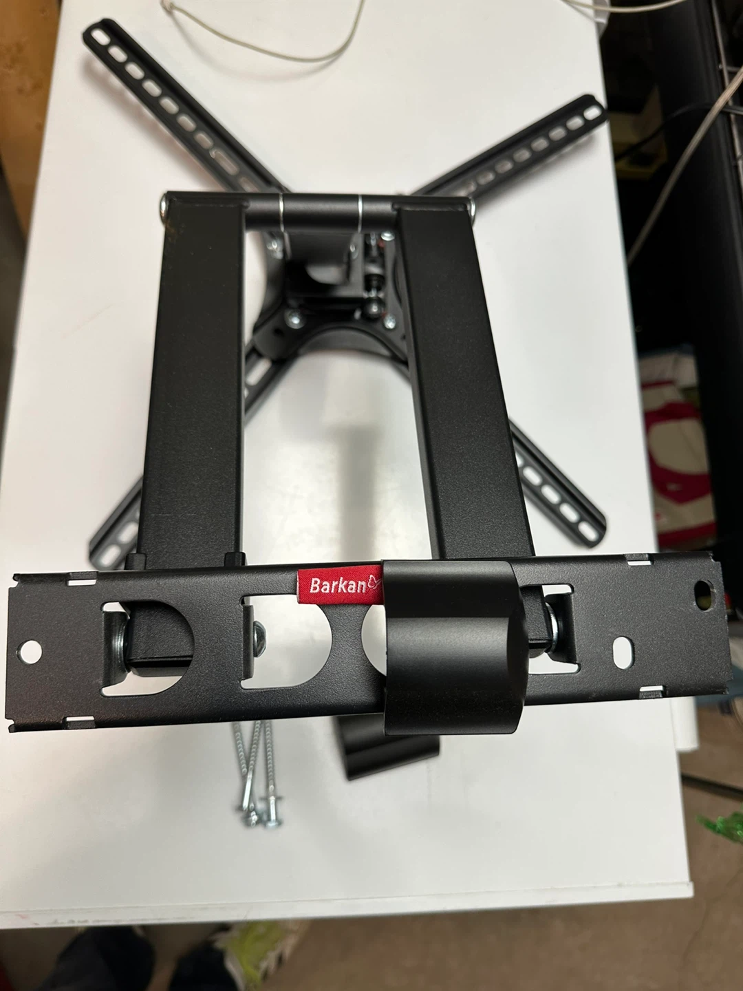 This is a Barkan articulating TV wall mount. It's made of black metal and includes mounting hardware. Great for mounting your television to the wall!