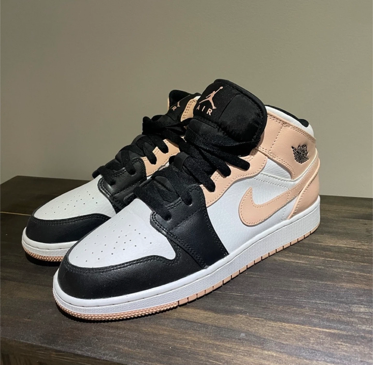 Selling a pair of Nike Air Jordan 1 Mid sneakers in size 7Y US. They feature a stylish combination of black, white, and peach colours. Great for everyday wear!