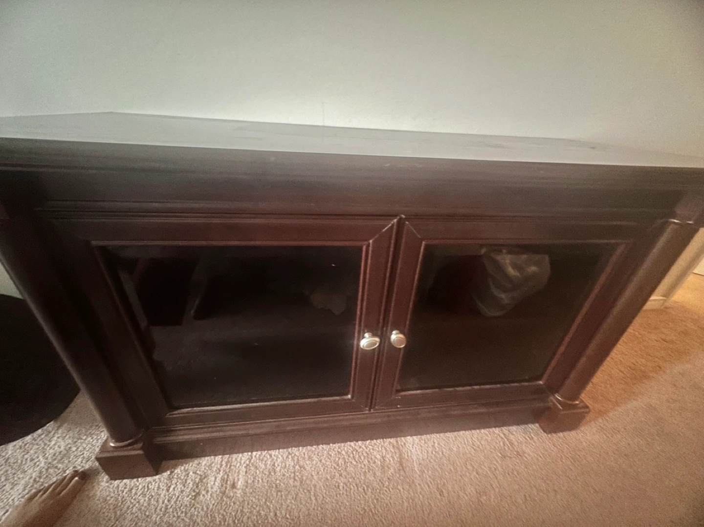 Dark brown wooden cabinet. Features two glass doors with silver knobs. Offers storage space. Good for living room or entertainment centre.